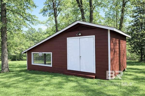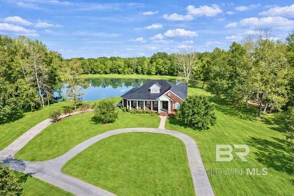 This gorgeous residence is situated on over 5 acres of land, boasting a picturesque pond stocked with bass and brim. Located 6 miles from North Baldwin Infirmary and Novelis, this property offers exceptional seclusion. The 4-bedroom, 3.5-bath home is equipped with every amenity one could desire. The custom gourmet kitchen features a coffered ceiling, granite countertops, stainless steel appliances, a natural gas range, and an abundance of custom cabinets. The formal dining area is ideal for entertaining and family gatherings. Both the living room and master bedroom have gas fireplaces. The master bedroom features a spacious walk-in closet and brand new carpet in master bedroom and closet. The master bath is equipped with a jacuzzi tub, a large walk-in shower, and double vanities. Going downstairs a dumbwaiter provides convenient access to the upper levels. The finished walk-out basement has been completely renovated to include a new 4th bedroom. The basement features a kitchenette, living room, 2 bedrooms, a large walk-in closet, and a spacious storage closets as well as 1 full bath. The covered patio offers a serene view of the surrounding woods and pond, with natural gas hookups for an outdoor kitchen. The property is equipped with a full-house 24kw Generac generator, installed in August 2022, with a 10-year warranty. Additional features include a 12x16 storage shed with built-in shelves and an attached 12x16 chicken/duck coop, complete with electricity, lighting, running water, and an outdoor sink. A one year Home Warranty through American Home Shield will be provided by seller. Seller is offering commission to buyers agent. Price is negotiable, schedule an appointment to view this home today. This exceptional property is a must-see.Home sits on PPIN #'s 257640 & 55646. All information provided is deemed reliable but not guaranteed. Buyer to verify all information during due diligence.