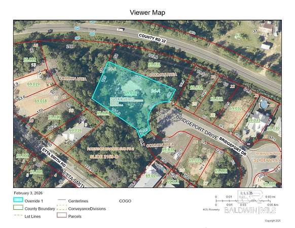Head west on CR 32 from Hwy 59 in Summerdale. Just east of the Fish River Bridge, take a left on Etta Smith Road into the Robinson Branch Subdivision. Take a left on Bridgeport Drive and at the end of the cul-de-sac you will see the lot. The neighborhood boat launch and pier house and other amenities will be on the right as you drive on Etta Smith Road, prior to reaching Bridgeport Drive.