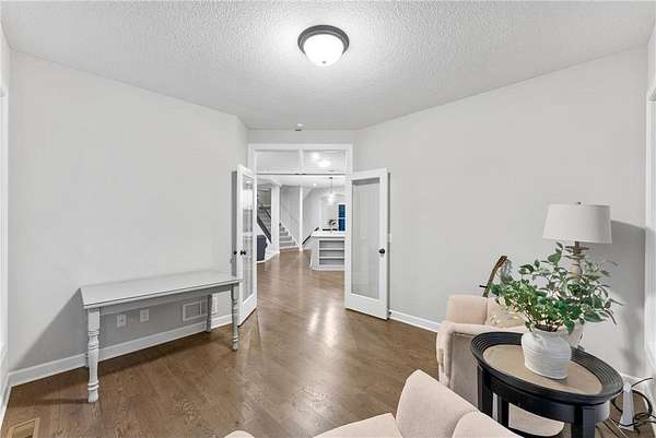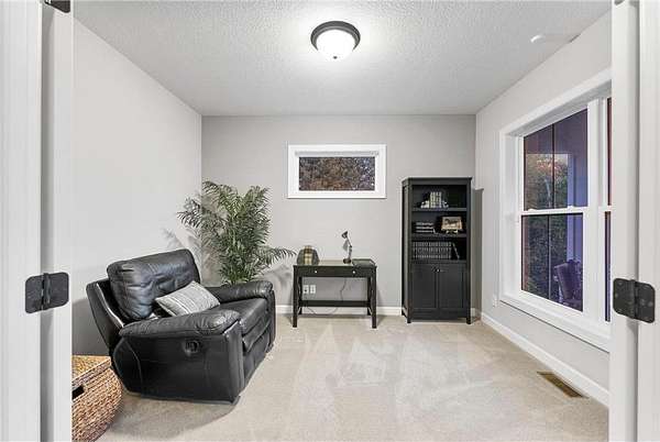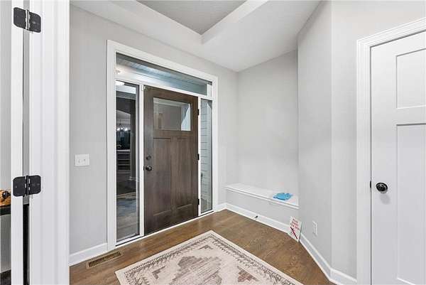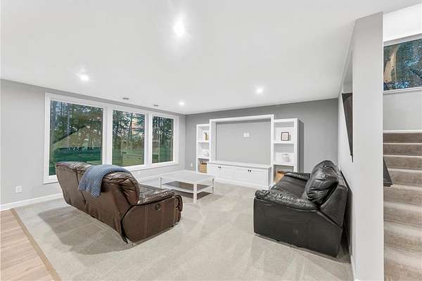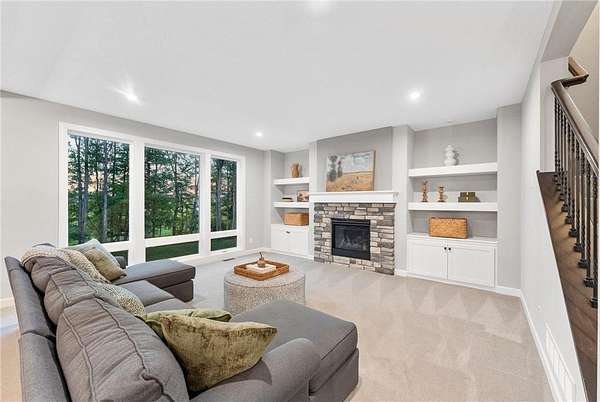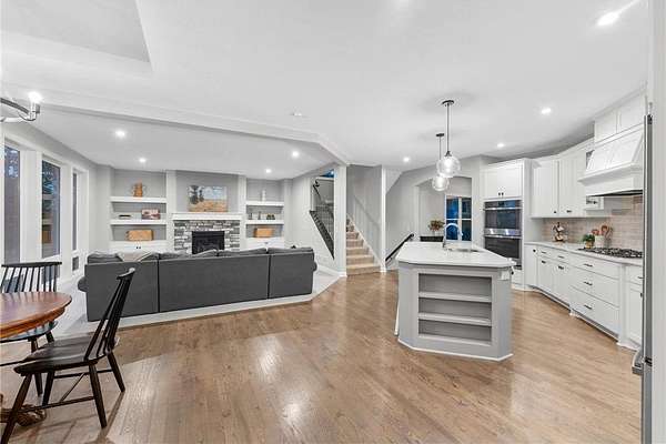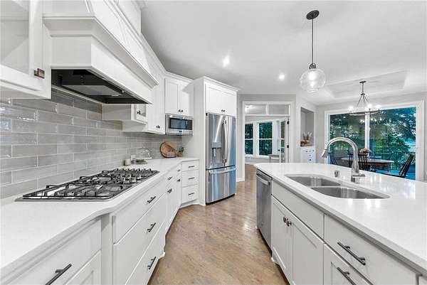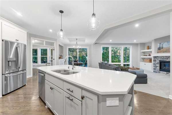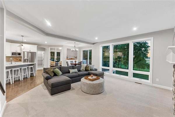 Designed for everyday living and entertaining, the home features a bright open layout with floor-to-ceiling Pella windows showcasing panoramic lake views. The gourmet kitchen includes an oversized island, double ovens, walk-in pantry, and flows into the sunroom and living room with fireplace. A main-level office adds flexibility.