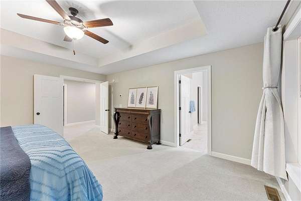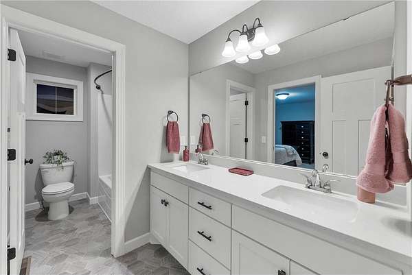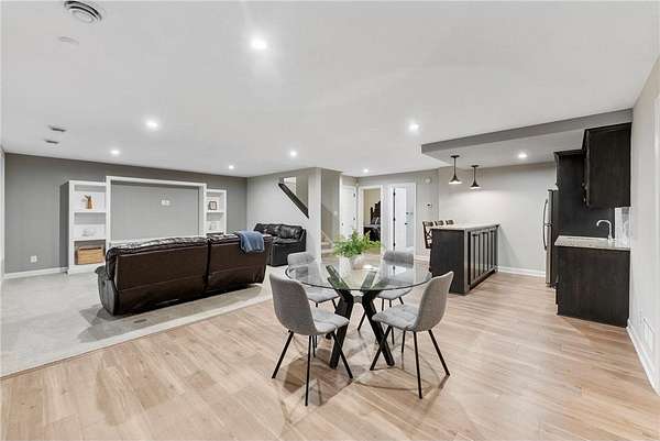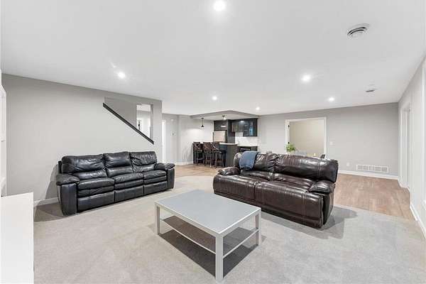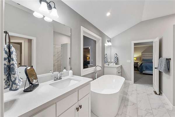 Upstairs offers four bedrooms on one level, including a spacious primary suite with lake views, spa-style bath, soaking tub, dual shower, and large walk-in closet, plus upper-level laundry. The finished walkout lower level includes a family room, wet bar, guest or in-law suite, and flex space.