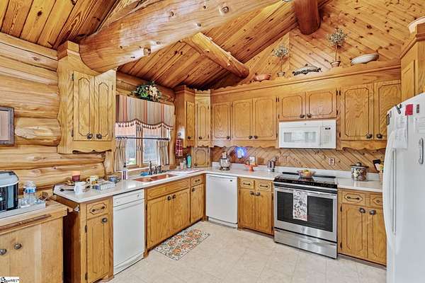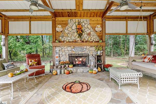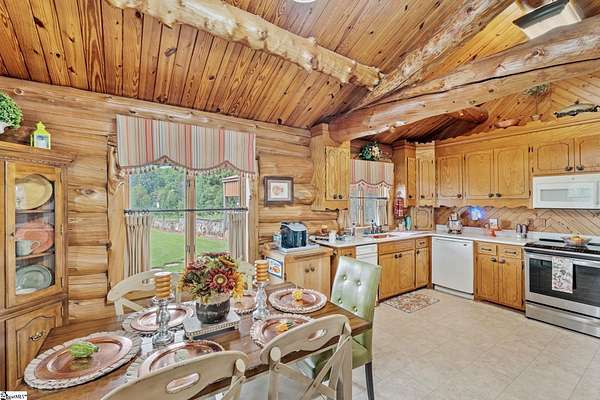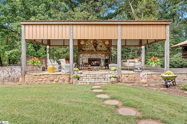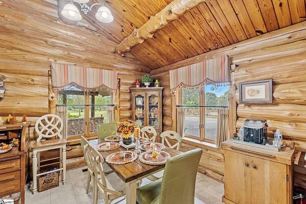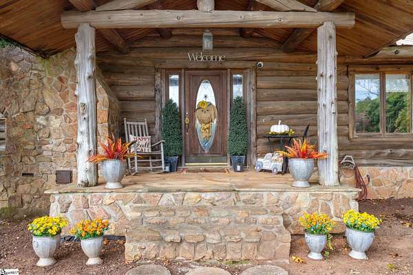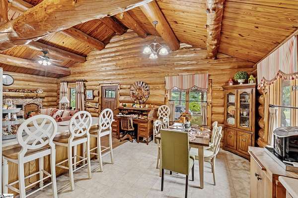 Welcome to "Just Peachy Cabin" This one-of-a-kind, handcrafted custom log home sits on over 5 beautiful acres offering the perfect blend of craftsmanship, comfort and country living. Featuring 3 bedrooms and 2 baths on the main floor, plus a finished basement with two additional rooms with closets and a full bath. This home provides ample space and flexibility. Enjoy the outdoors year-round from the gorgeous veranda with a wood burning fireplace, overlooking the in-ground saltwater pool with a recently updated pump and liner. The property boasts pecan trees, palm trees and a spacious turnaround driveway with plenty of parking, including an attached 2 car carport and a basement level garage. Every detail of this home is custom, down to the logs brought in from the Canadian border to the stones found in the family's peach fields! You will not find a single nail or screw as the logs are tied together with wooden pins. Experience the rustic and timeless history in this truly unique log home- a rare gem you won't find anywhere else!