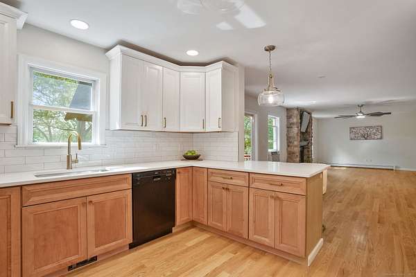 This stunning 4-bedroom colonial home is truly exceptional. As you arrive at this impressive residence, perched just above the Bethel Reservoir and only 5 minutes from town, you'll feel immersed in nature, surrounded by beautiful gardens, far removed from the hustle and bustle of daily life. The elegant foyer features a grand staircase and a Palladian window, creating a soft and inviting atmosphere. To the right, you'll find a dining room with ample storage, and to the left, a cozy pine office equipped with built-in glass cabinets and bookshelves that overlook the charming front yard, making it perfect for working from home or writing your next novel. At the back of the house, an expansive great room boasts gleaming hardwood floors that run throughout the house, a stone fireplace, sliders leading to the deck, a ceiling fan, and a brand-new gourmet kitchen equipped with an induction range and quartz countertops, seamlessly blending modern convenience with classic charm. Upstairs, the spacious master suite includes walk-in closets and an en-suite bath, along with three additional large bedrooms and a sparkling new full bath. The lower level features a walkout with beautiful woodwork, a large wet bar, and a stunning prep room that once housed a sink and stove but now showcases a fantastic butcher block.