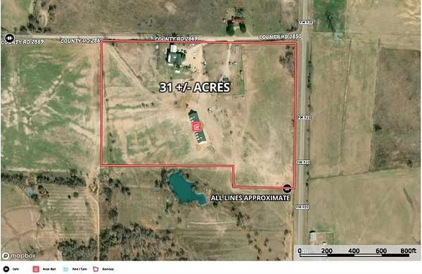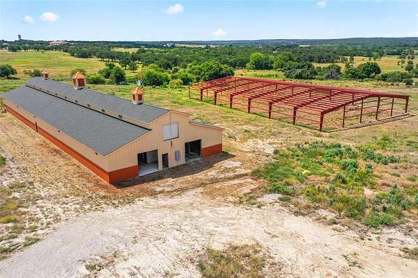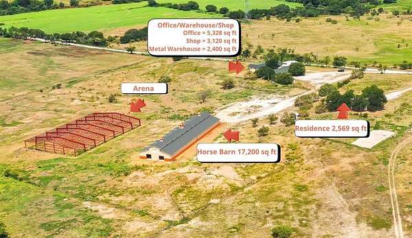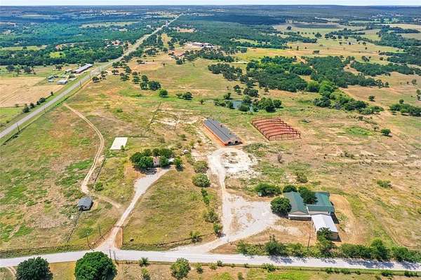 Approximately 31 acres 5.5 miles north of Poolville and 12 miles northwest of Springtown. Outside of city limits with no known restrictions. This property has a very nice 5,328 sq ft 2 story building that could be a residence, or office facility with 11 offices, 1 full bathroom, 3 half bathrooms, 2 kitchenettes and 2 conference rooms. Attached to the office space is a shop and metal warehouse. There is also a monitor style horse barn behind the office with room for 42 stalls that was originally constructed in 2019. There is a covered arena building that was started but not completed as well.