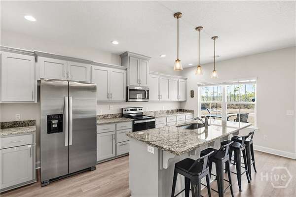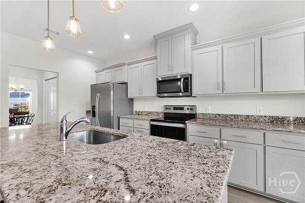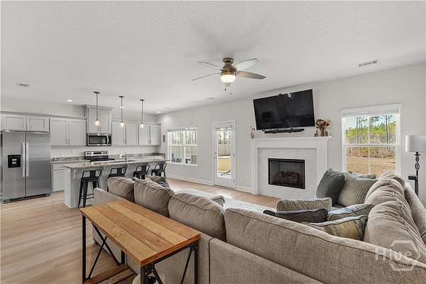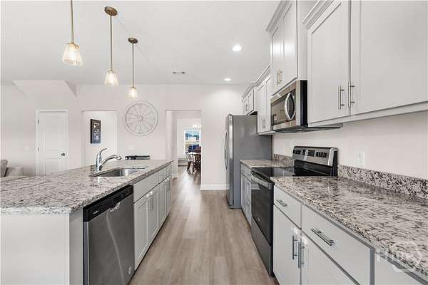 Welcome home to 173 McClelland Loop NE in the beautiful Paxton Hill community, set on over 3 acres in Long County, offering incredible space inside and out! This thoughtfully designed 5-bedroom, 3-full-bath home is perfect for everyday living and entertaining. A stunning two-story foyer welcomes you with a formal dining room just off the entry. Continue through a hallway with a large pantry into the kitchen, featuring custom cabinetry, granite countertops, stainless steel appliances, and a large island overlooking the living room with a cozy fireplace and patio access. A main-level bedroom and full bath provide ideal space for guests or a home office. Upstairs includes three additional bedrooms, a hall bath, laundry room, and the spacious owner's suite. The owner's retreat offers a vaulted ceiling, dual granite vanities, soaking tub, separate shower, and a large walk-in closet. Granite countertops are featured in all bathrooms. Conveniently located near local schools and positioned between Hinesville/Fort Stewart, this home blends privacy, space & convenience!