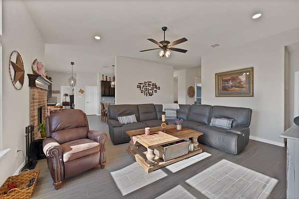 Step inside to a welcoming semi-open concept layout featuring a spacious living room ideal for entertaining or relaxing. Large windows fill the home with natural light, highlighting the cozy brick fireplace—perfect for those cooler evenings.