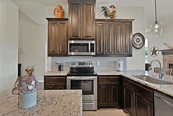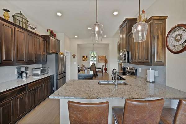 - Decorative Lighting, Double Vanity, Eat-In Kitchen, Granite Counters, Kitchen Island, Pantry, Walk-In Closet(s)