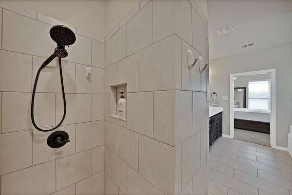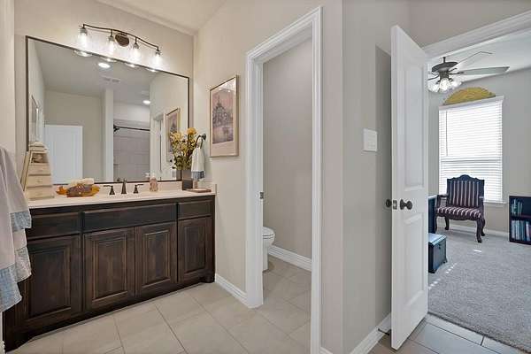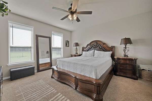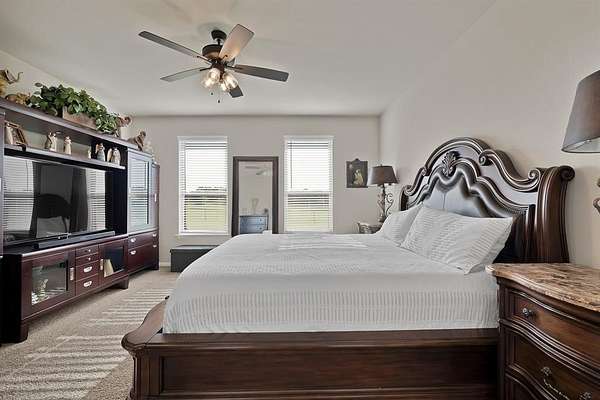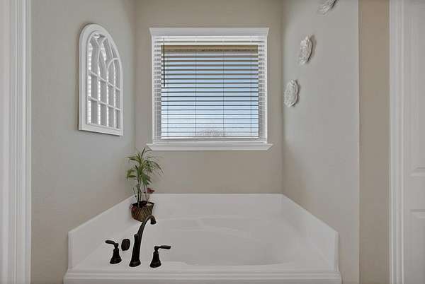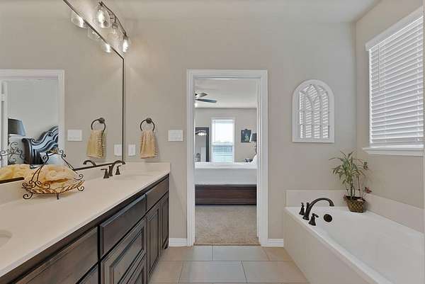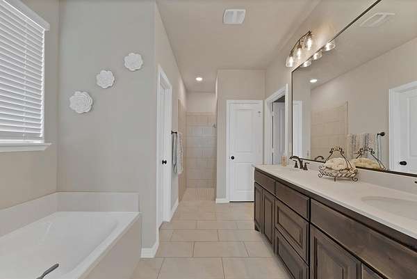 The primary suite offers comfort and convenience with a dual vanity, separate soaking tub and shower, and a generous walk-in closet.