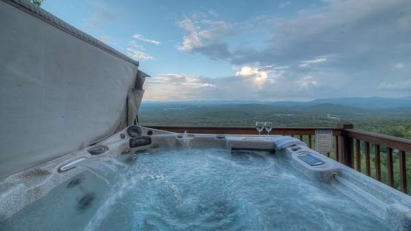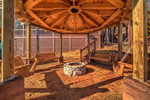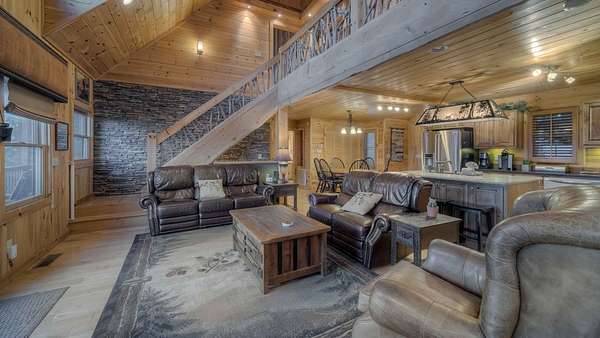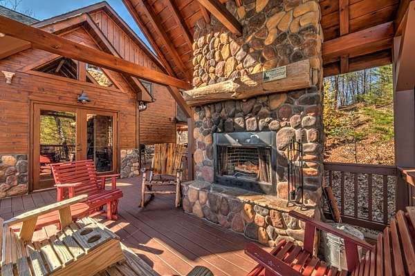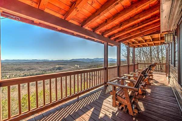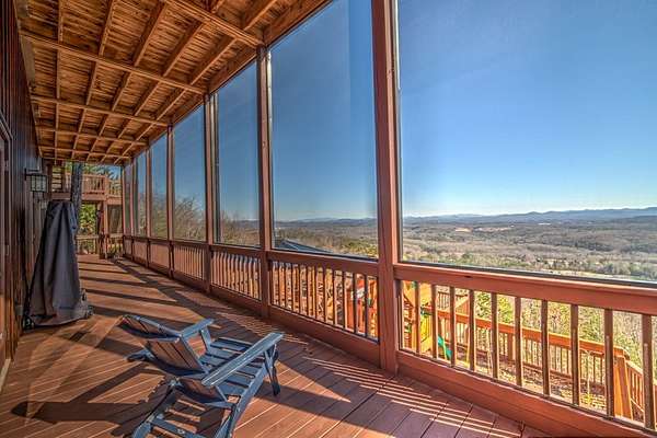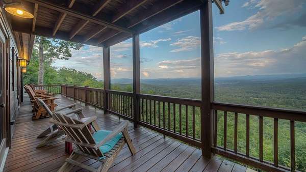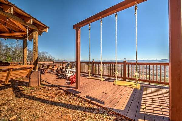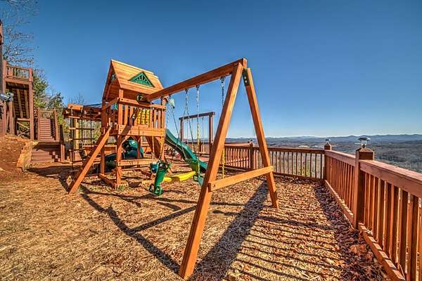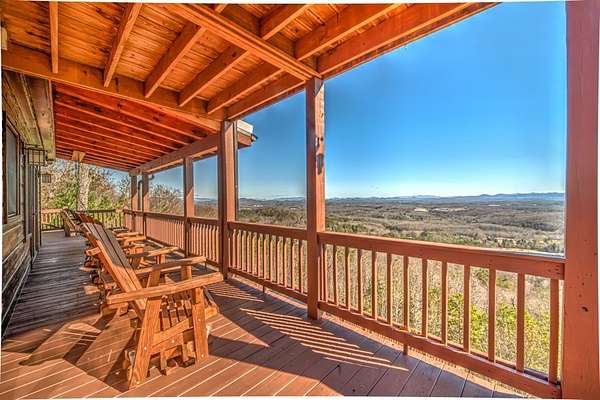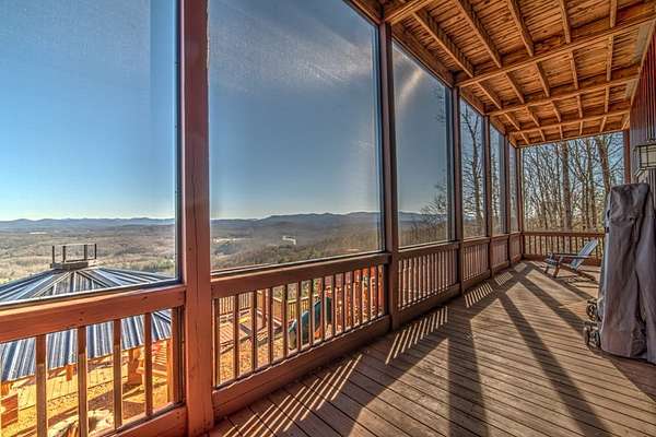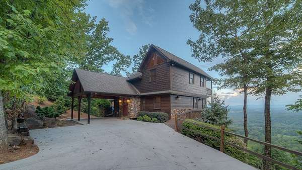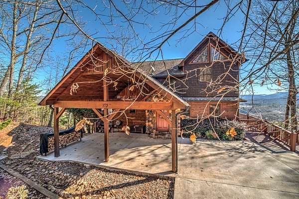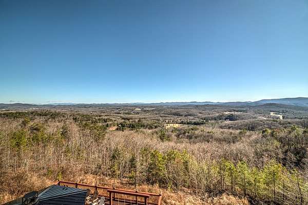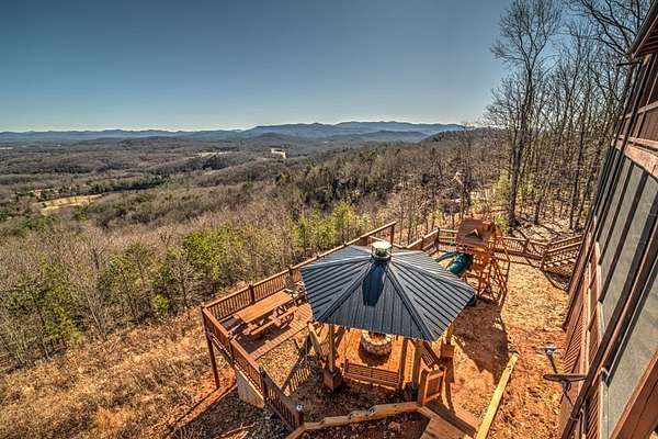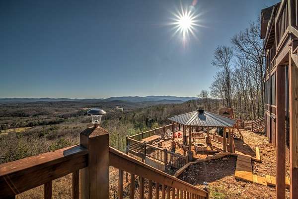 Welcome to Blue Mist Heaven, a spectacular 4BR/3BA luxury mountain cabin offering breathtaking 180 panoramic mountain views, exceptional outdoor living, and strong appeal as both a high-performing vacation rental and private retreat—just 10 minutes from downtown Blue Ridge. This beautifully designed tri-level showplace sleeps up to 12 guests and features soaring floor-to-cathedral-ceiling windows, two impressive river rock gas fireplaces, and upscale mountain-modern finishes throughout. The spacious great room is the heart of the home, perfect for entertaining or relaxing beside the fire while taking in the incredible views. The gourmet kitchen is a chef's dream with dual ovens, granite countertops, premium appliances, bread-warmer drawer, and generous seating including dining table, island seating, and additional breakfast space—ideal for hosting large gatherings. The upper-level owner's suite offers a private sanctuary complete with vaulted ceilings, screened-in porch, electric fireplace, Jacuzzi tub, custom river rock shower, and dual granite vessel sinks. King suites on multiple levels open directly to the expansive wraparound deck, maximizing indoor/outdoor mountain living. Designed for entertaining and guest enjoyment, the terrace level features a theater room with 82” screen, recliners, wet bar, ect, Outdoor amenities truly set this property apart: Covered outdoor fireplace ,Wraparound decks with panoramic views, Screened-in porch retreat Large level backyard (rare for mountain homes)Lighted gazebo with bench swings, Rock fire pit gathering area, Playground set with slides & swings, Picnic and lounge deck spaces, Ample paved parking. Additional features include high-speed internet, multiple entertainment spaces, library/loft flex area, laundry facilities, and dog-friendly setup. Whether you're searching for a luxury full-time residence, turnkey mountain getaway, or income-producing investment property, this exceeds expectations!