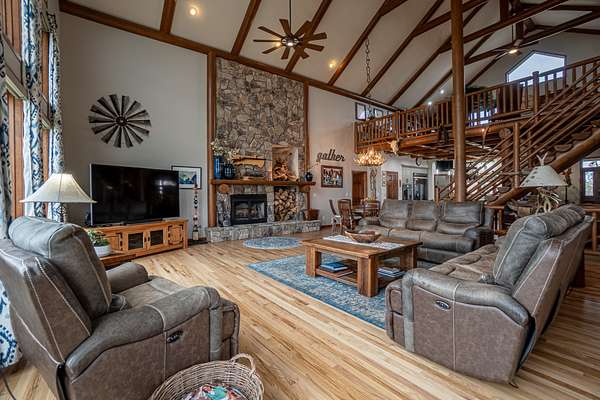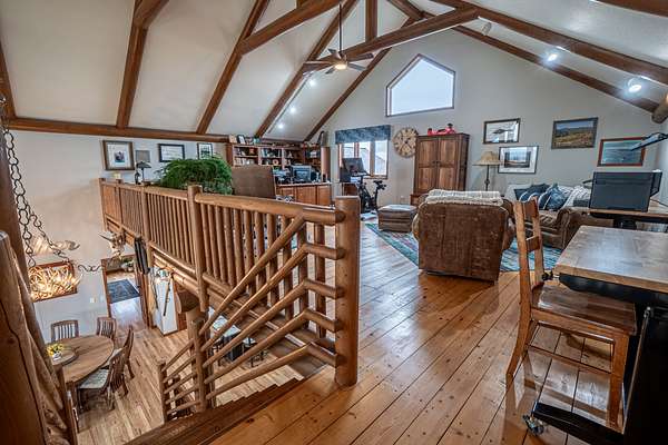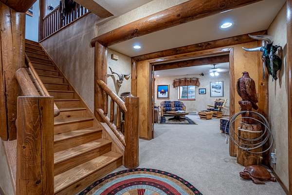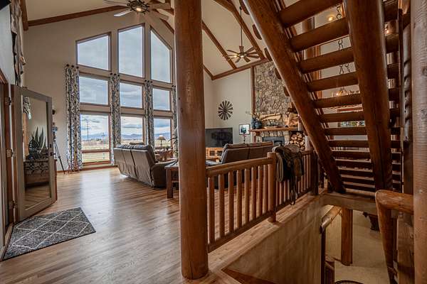 The home has Colorado feel with tasteful updates. It totals 6,752 square feet with 4 bedrooms plus a loft, 4 bathrooms, and an attached 3-car garage. The main living area features vaulted ceilings, a large wall of windows capturing the mountain views, and a stone wood-burning fireplace. The kitchen has been updated with high-end finishes, and the primary bathroom has been fully remodeled. Downstairs includes a great bar and entertainment space.