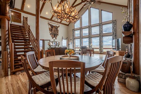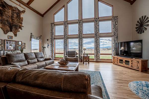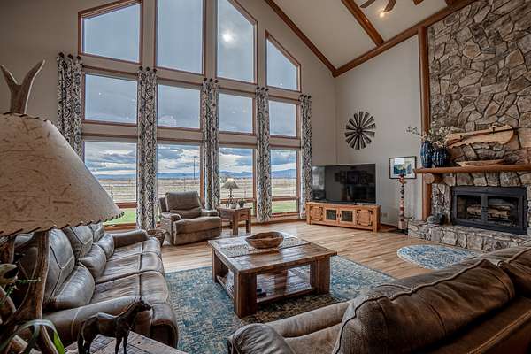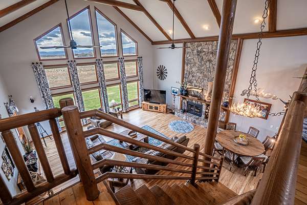Vaulted ceilings with a dramatic full wall of windows framing mountain views
