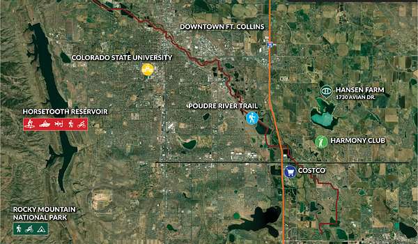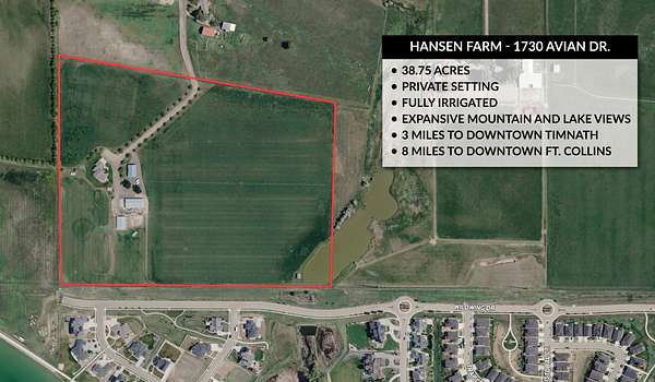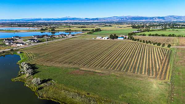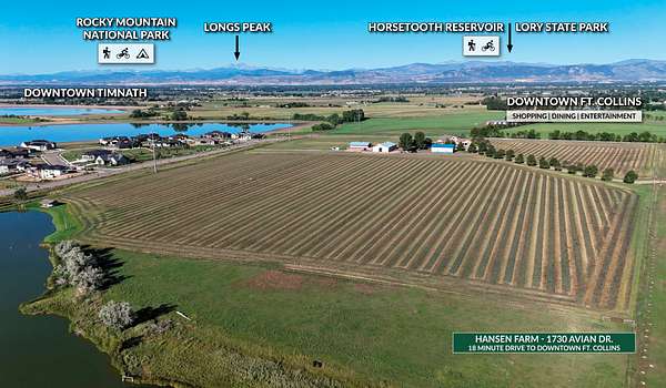 Positioned on the north side of Timnath Reservoir and bordering the custom homes of WildWing, the property offers a unique mix of agricultural ground and high-end surroundings. The views over the reservoir and out to the Rockies are a standout feature. At the same time, you’re just 5 minutes to Timnath and 10 minutes to Old Town Fort Collins, making it easy to get the best of both rural and town living.