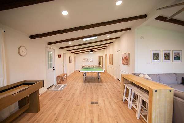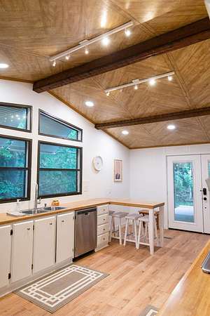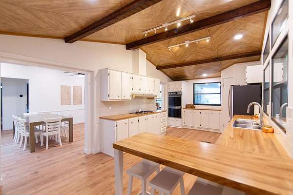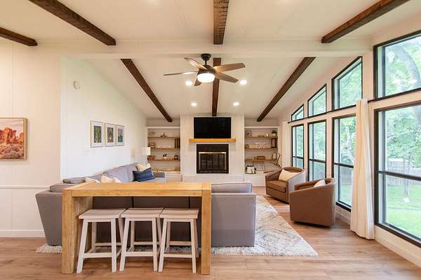 - Beamed Ceilings, Bookcases, Breakfast Bar, Built-In Features, Ceiling Fan(s), Ceiling-High, Chandelier, Kitchen Island, Laminate Counters, Pantry, Primary Bedroom On Main, Vaulted Ceiling(s), Walk-In Closet(s)