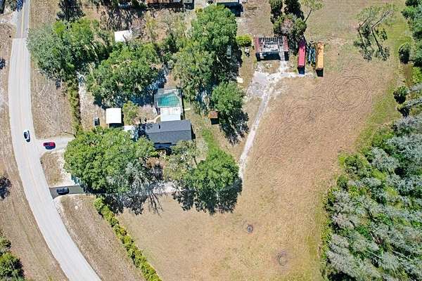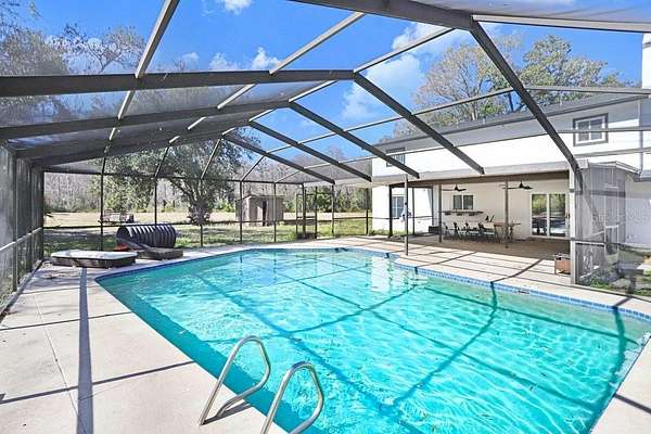 Nestled in the highly desirable Odessa area, this farm pool house sits on two parcels totaling 5.77 acres, complete with a serene pond at the rear and a wealth of potential. The partially updated 3-bedroom, 3-bathroom home spans 2,372 square feet and awaits its new owner to finish the transformation into a dream retreat. The first floor offers a formal living room, formal dining room, a well-appointed kitchen with quartz countertops, stainless steel appliances, and ample storage, conveniently situated between the dining room and the spacious family room. The oversized family room features a wood-burning fireplace and French doors opening to a screened-in pool, perfect for entertaining or tranquil evenings. Upstairs hosts the master suite with an office/bonus room and an en suite bath featuring his-and-her sinks and a stand-alone shower. Two additional guest bedrooms and a guest bathroom complete the upper level. An attached two-car garage adds convenience, while the outdoor oasis showcases a koi pond with a waterfall, wooden decking for seating, and a screened-in pool set against expansive land. Additional outbuildings include a two-car carport and extra storage sheds. Notably, the home sits on one parcel, with the second parcel offering potential for another residence or the possibility of selling it separately. Conveniently located near the Veterans Expressway, this property provides easy access to all of Tampa, making it an ideal canvas for a buyer seeking space, privacy, and future