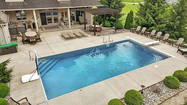 Welcome to this exceptional two-story home nestled on 5 acres of private, partially wooded land with an inground pool and outbuilding. The property offers the ultimate privacy, with a long, gated driveway leading to this beautifully designed residence. The grand two-story foyer sets the tone as you enter, showcasing elegant crown molding throughout. Step into the formal dining room with wainscoting and large windows that flood the home with natural light, highlighting the open and airy floor plan. The gourmet kitchen is a true chef's dream, featuring granite countertops, a built-in double oven, and stainless steel appliances. The main floor is home to a luxurious owner's suite, complete with a spacious walk-in closet, dual vanities, a standalone soaking tub, and a separate tile shower, providing a perfect retreat. The main floor also offers a large laundry room, mudroom with built-in lockers, and convenient access to the rest of the home. Upstairs, you'll find four additional bedrooms and two full bathrooms, offering plenty of space for family and guests. The fully finished basement is a standout feature, offering a full kitchen, a built-in safe, 6th bedroom and another laundry room, making it perfect for entertaining or multi-generational living. The exterior of the home is just as impressive, with a large, beautiful patio area complete with a wooden pergola, perfect for enjoying the outdoors. The inground pool is an oasis of relaxation, and the outbuilding provides additional storage or workspace. This is a rare find, offering both luxurious living and privacy in a peaceful, picturesque setting. Schedule your tour today!