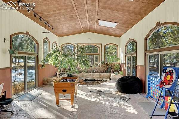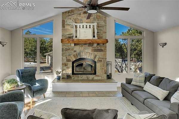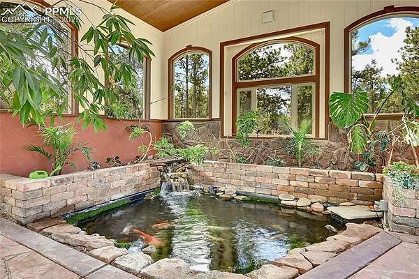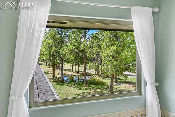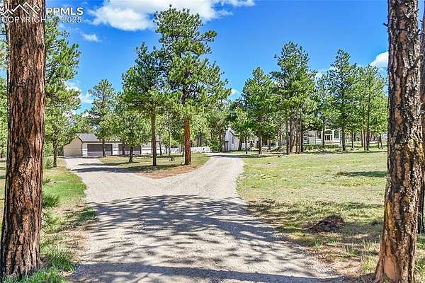 This is your opportunity to own one of the few remaining 20 acre heavily treed properties in sought after Black Forest. This Modern Farmhouse is perfectly nestled in the towering ponderosa pines with tons of privacy. Upon entering you are welcomed by your very own pond and water feature complementing the serene setting. The stamped concrete pathway winds its way to the front entry with expansive covered porch perfect for watching sunsets. The front door opens into an inviting entryway with vaulted ceilings, new hardwood floors throughout the main level and a custom coat closet built in. Located just off the entry step into an expansive great room featuring a soaring wall of windows peering out into the trees, radiant floor heat, north and south bay windows and a 2-story stone surround spectacular wood burning fireplace- a must have for the Colorado winters. The adjacent eat-in kitchen boasts new granite countertops, solid wood cabinetry, gas range in island and large walk-in pantry. There is a formal dining room with its own wood fireplace connected to the kitchen making those dinners with friends extra special. Even better, take dinner outside to the back deck to enjoy the fresh air & views. Or BBQ on your oversized patio perfect for entertaining and relaxing by the fire pit. Upstairs features 3 bedrooms, the Master suite complete with a gas fireplace, sitting area and has its own private patio. The adjacent master bath has new double vanity, jacuzzi tub and steam shower. The basement features new carpet, 2 more bedrooms, family room and freshly updated full bath. The two story garden room/atrium with radiant floor heat and Koi pond with waterfall brings the outside indoors with abundant sunlight. The low maintenance stucco home and detached 8 car garage have fresh paint and new class IV roofs. The 60 x 30 barn, shed and hen house also have new paint and roofs. Welcome home to your private oasis. Don't miss out on this rare opportunity to call this HOME.