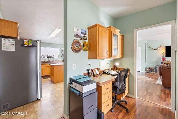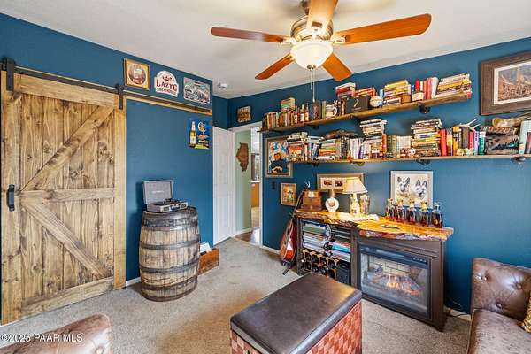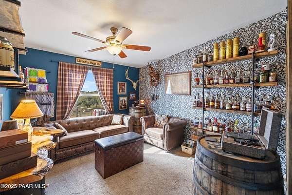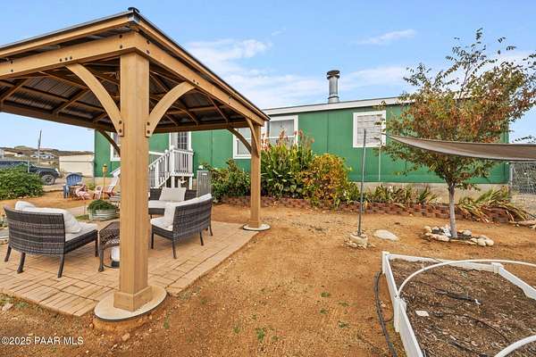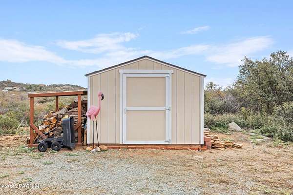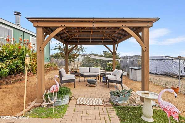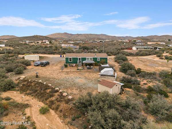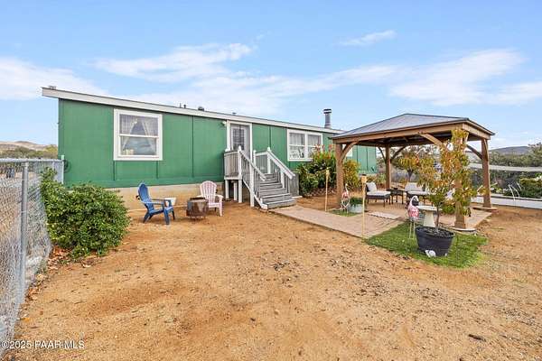 Welcome to this beautifully maintained three bedroom manufactured home nestled in a quiet neighborhood where each property sits on 2+ acres, offering true space between neighbors and the peace of country living--all while remaining close to everyday amenities and the Prescott National Forest.A highlight of this home is the front deck, perfectly sized for grilling, relaxing, and taking in the dark-sky ordinance views that make for incredible stargazing and is the perfect vantage point for sunsets and monsoon watching. The sliding glass door brings in open views and stunning natural light along with ease of entry.Inside, you'll find a spacious, open living and dining area--ideal for gatherings--with a cozy wood fireplace at the center. The kitchen offers plentiful counterspace, a large island, a separate breakfast counter, and a pantry. A convenient hallway workspace adds functionality for work, hobbies, or study. Laundry room has access to backyard and laundry appliances convey along with freezer chest.This home includes a generous primary suite with his-and-hers walk-in closets, dual vanities, and a relaxing soaking tub. Two additional bedrooms and a bathroom are also available on this split floorplan.Step into the fenced backyard, perfect for pets and outdoor living. Enjoy evenings under the gazebo, especially during summer storms, while taking in the open backyard views. The property features pavers, raised garden beds, flower beds, berry bushes, and even a peach tree. A shed provides additional storage, and there's plenty of room for vehicles, tools, and all your recreational toys. A 20ft Conex container also conveys with the property! The nearby creek/wash flows when it rains, adding to the tranquil setting and frequent visits from local wildlife.With a friendly community, wide-open skies, and the best of country living combined with convenience, this home offers an exceptional lifestyle--inside and out.