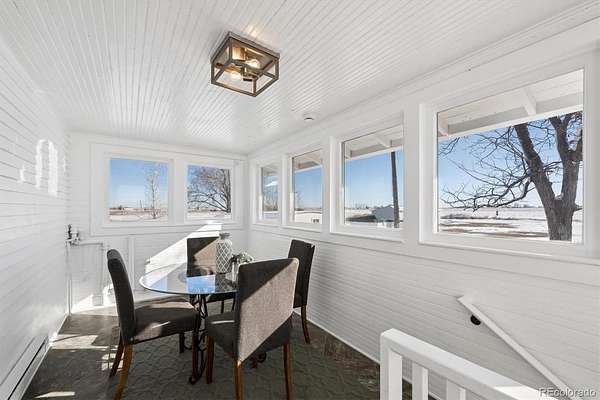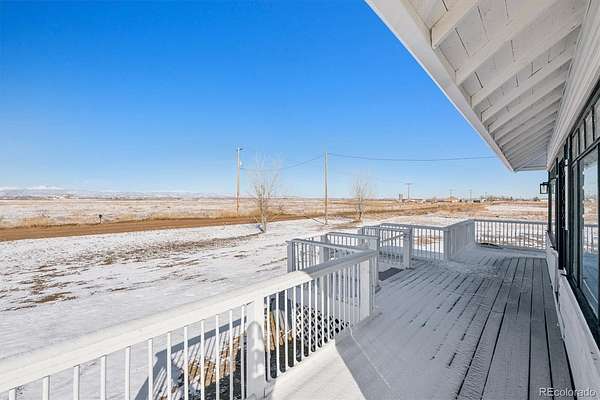 Outdoor living includes a large front deck with Front Range views, enclosed sunroom, rear patio, and open acreage.
