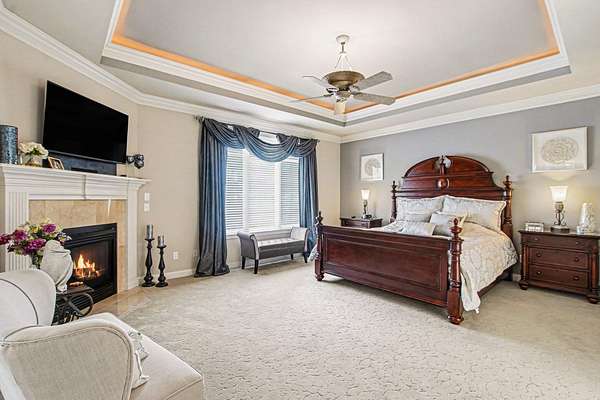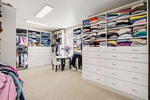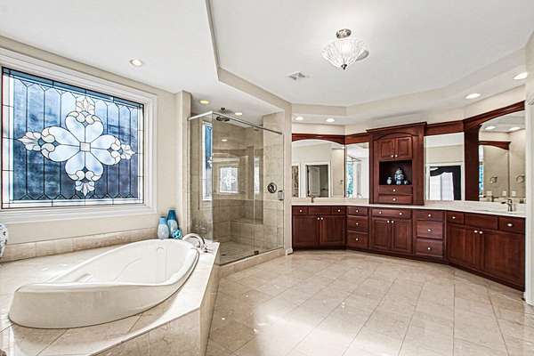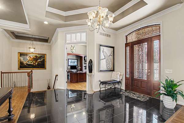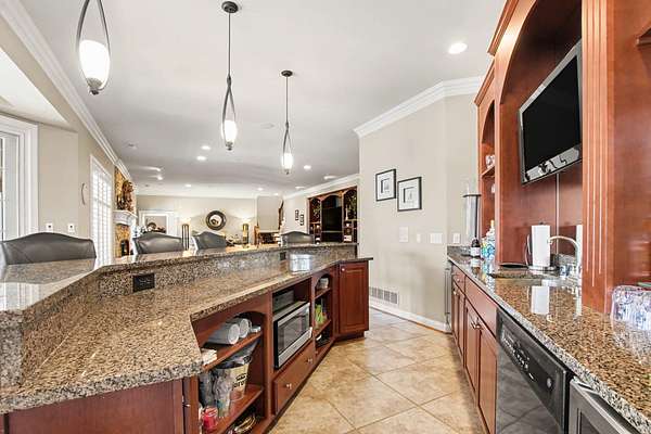 - Bookcases, Breakfast Bar, Built-In Features, Butler's Pantry, Ceiling Fan(s), Chandelier, Coffered Ceiling(s), Crown Molding, Double Vanity, Dry Bar, Eat-In Kitchen, Entrance Foyer, Granite Counters, High Ceilings, Kitchen Island, Master Downstairs, Multi Panel Doors, Open Floorplan, Pantry, Recessed Lighting, Soaking Tub, Tray Ceiling(s), Walk-In Closet(s), Wet Bar, Wired For Data, Wired For Sound