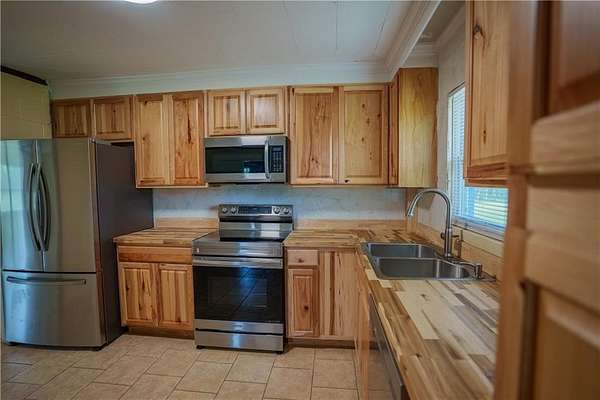 New hickory cabinets, butcher block countertops, and stainless appliances (stove, microwave, refrigerator, dishwasher)