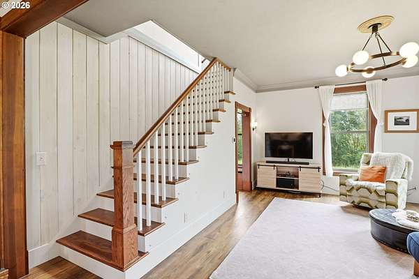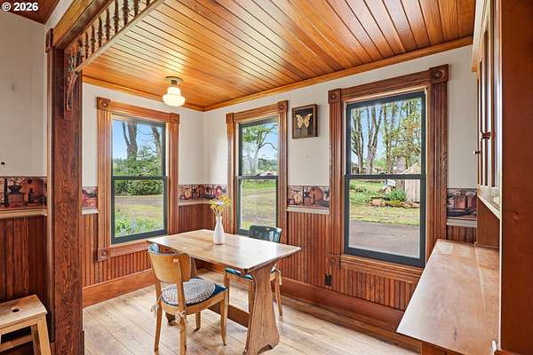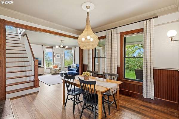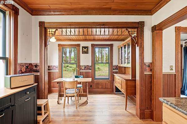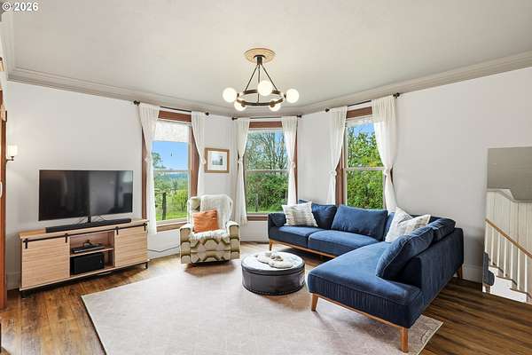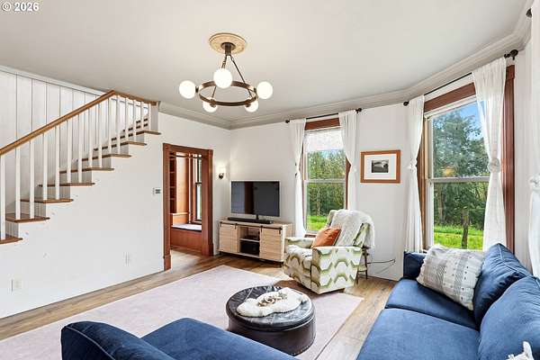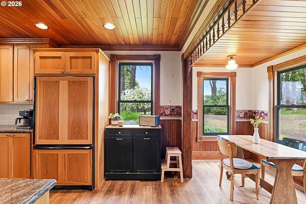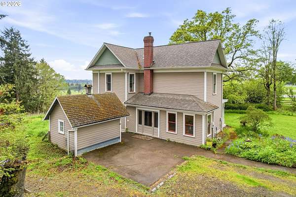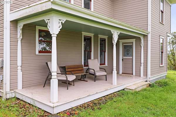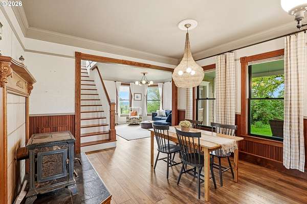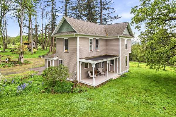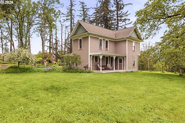 Steeped in history and full of character, this Queen Anne-designated historic landmark farmhouse, known as the Julia Staudinger House, sits on 32 beautiful acres, offering a rare combination of charm, functionality, and usable land.The home showcases custom millwork, vintage hardware, wainscoting, tongue-and-groove paneling, and unique period lighting. A stunning built-in library with rolling ladder adds warmth and character, creating a cozy and inviting space. The "fishbowl-style" living room is surrounded by windows, bringing in natural light and capturing peaceful views of oak trees, gardens, and the surrounding landscape.The kitchen blends classic style with modern updates, featuring granite countertops and panel-ready (cabinet-front) appliances for a seamless look. Upstairs offers three bedrooms, including a flexible adjoining space off the primary that can serve as an additional bedroom, office, or bonus room. Enjoy valley views from the inviting front porch, or take advantage of the expansive property, which includes the original historic barn with dairy stalls, a pole barn with additional stalls and storage, established fruit tree orchards, garden space with raised beds, and an additional outbuilding suitable for a studio, office, or hobby space. There is also an existing treehouse structure on the property. The acreage provides opportunity for a mini farm, hobby agriculture, or simply space to enjoy the surrounding setting. A truly special property offering historic significance, land, and lifestyle in one.