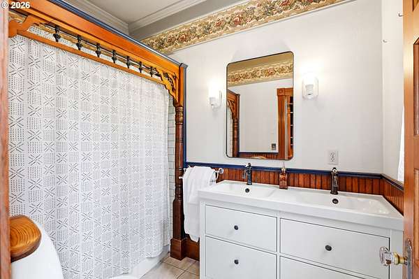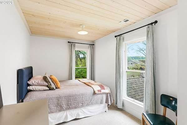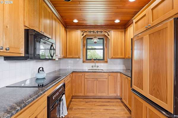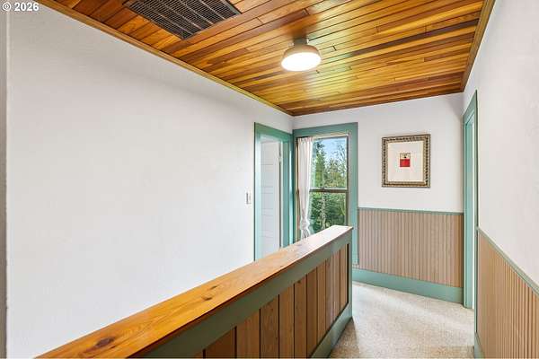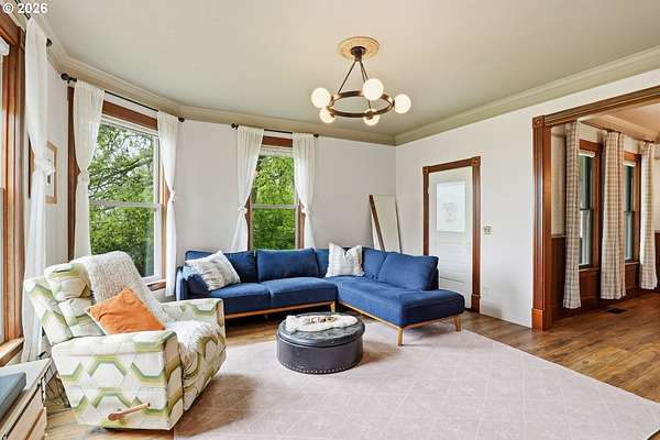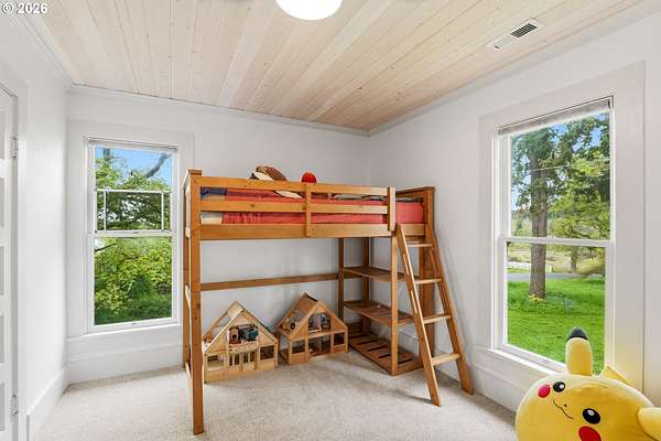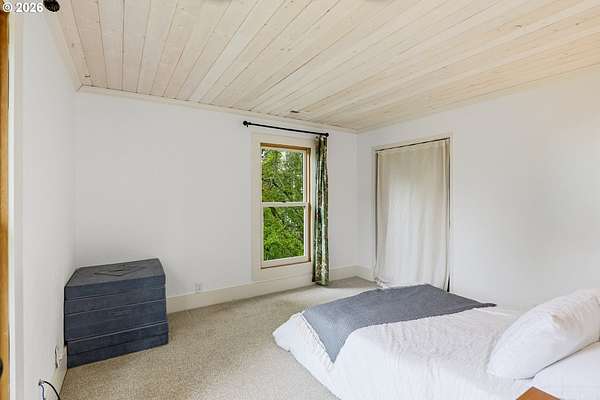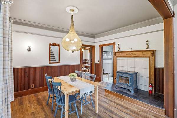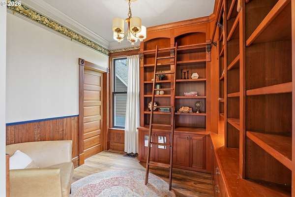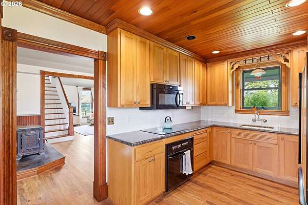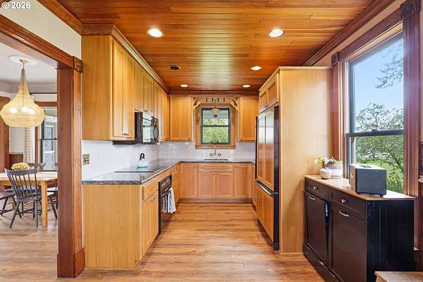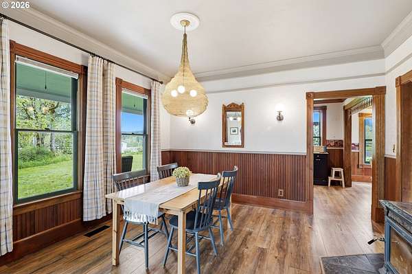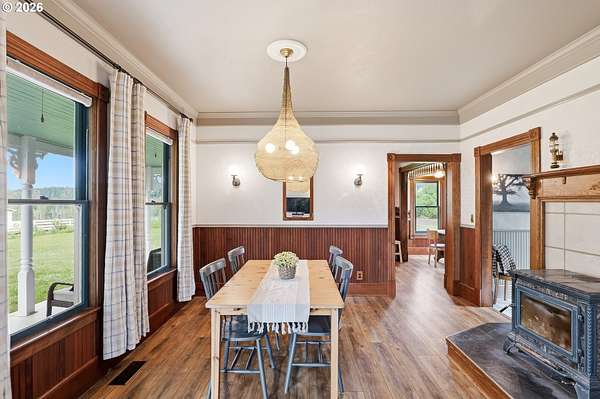 Steeped in history and full of character, this Queen Anne-designated historic landmark farmhouse, known as the Julia Staudinger House, sits on 32 beautiful acres, offering a rare combination of charm, functionality, and usable land.The home showcases custom millwork, vintage hardware, wainscoting, tongue-and-groove paneling, and unique period lighting. A stunning built-in library with rolling ladder adds warmth and character, creating a cozy and inviting space. The "fishbowl-style" living room is surrounded by windows, bringing in natural light and capturing peaceful views of oak trees, gardens, and the surrounding landscape.The kitchen blends classic style with modern updates, featuring granite countertops and panel-ready (cabinet-front) appliances for a seamless look. Upstairs offers three bedrooms, including a flexible adjoining space off the primary that can serve as an additional bedroom, office, or bonus room. Enjoy valley views from the inviting front porch, or take advantage of the expansive property, which includes the original historic barn with dairy stalls, a pole barn with additional stalls and storage, established fruit tree orchards, garden space with raised beds, and an additional outbuilding suitable for a studio, office, or hobby space. There is also an existing treehouse structure on the property. The acreage provides opportunity for a mini farm, hobby agriculture, or simply space to enjoy the surrounding setting. A truly special property offering historic significance, land, and lifestyle in one.