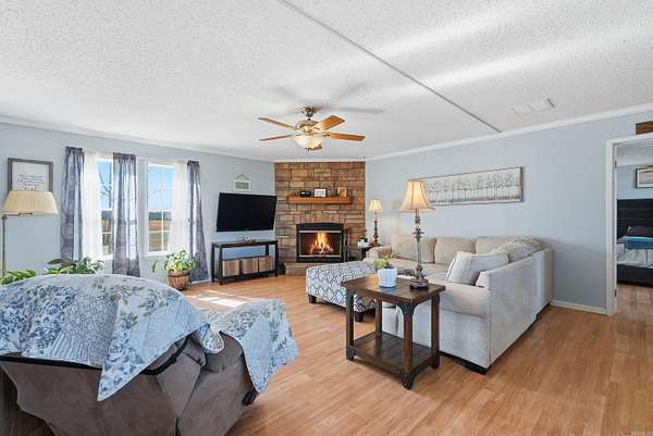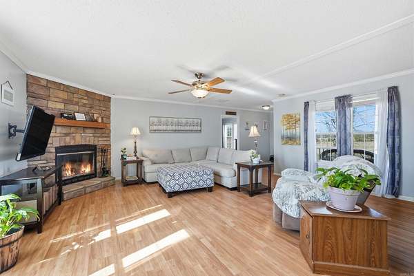 Enjoy peaceful country living on 10 acres with a barn! This well maintained home offers space and function for daily life. The open living and dining area features a fireplace and flows into a kitchen with abundant cabinet storage and workspace. The primary suite includes a walk in closet and a spacious bath with double sinks, separate shower, and soaking tub. Step outside to wide open views and usable land suited for animals, hobbies, and more. The large barn adds flexibility for agricultural or recreational use. A storm shelter adds peace of mind during severe weather. If you are searching for rural property, acreage, or a country home with land, this property delivers privacy and convenience, this is your dream home! Schedule a tour today.