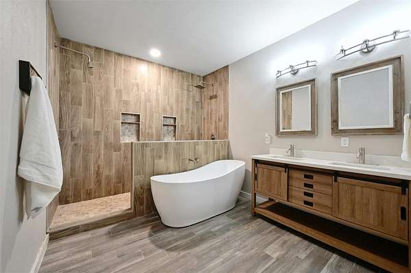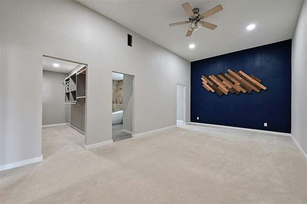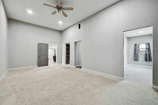- Ceiling Fan(s), Eat-In Kitchen, High Ceilings, In-Law Floorplan, Kitchen Island, No Interior Steps, Primary Bedroom On Main, Soaking Tub, Stone Counters, Walk-In Closet(s)