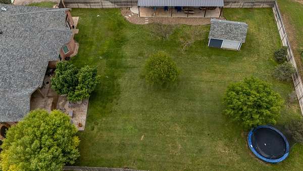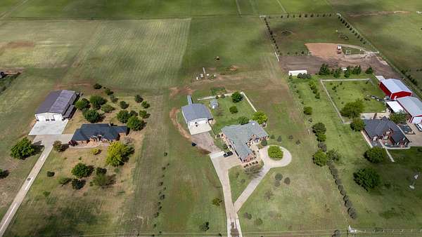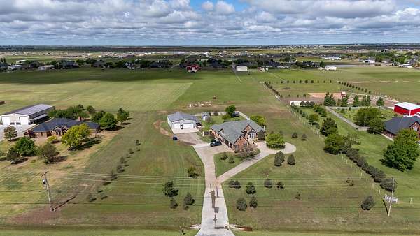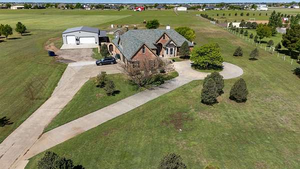 Step inside this beautiful 4 bedroom 3 bath home on approximately 5 acres in Dove Landing. Brand new Class 4 roof was put on in June. This home includes a formal dining room, an office, 2 living areas, and a 3 car garage. The 2nd and 3rd bedroom have a jack n jill bath. The 4th bedroom is upstairs along with an additional living area or playroom. This property includes a 40x50 shop (per seller) with concrete floors and 3 garage doors. The backyard is fenced with a large patio area. There is a class 4 roof, and a storm shelter located in the garage.