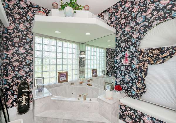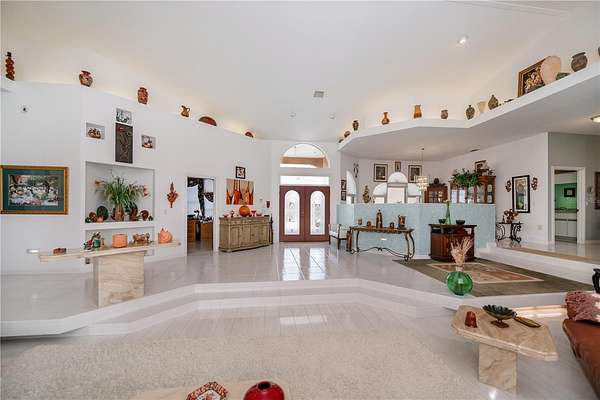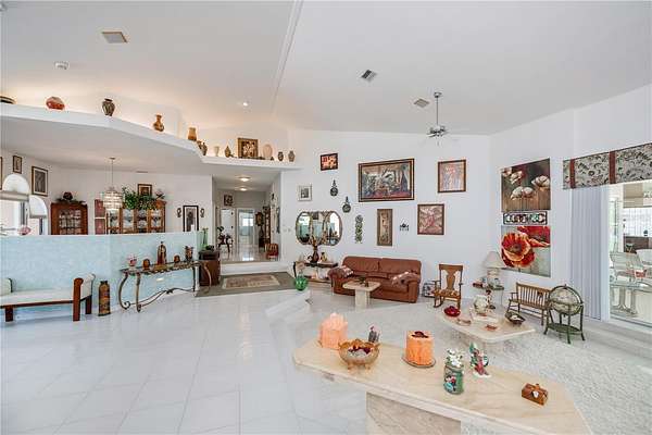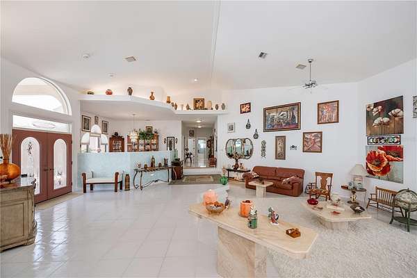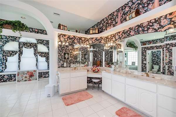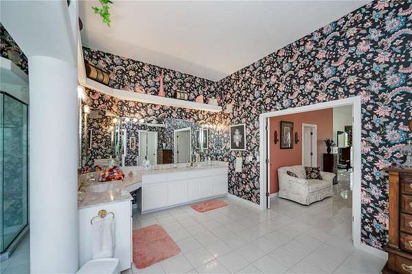 The tile roof, concrete curbing around landscaped features, and grand entryway will leave a lasting impression. Step through the double-door entry into a magnificent 5,548 sqft residence into a formal foyer featuring fine architectural finishes, elegant crown molding, decorator alcoves, and a soaring 20-foot ceiling. The abundant natural lighting and low-level corridor lighting set the stage for entertaining or relaxing in the beautiful living room with direct access to the beautiful pool/lanai area through expansive sliding glass doors. The screened-in pool deck, equipped with a heated saltwater pool and hot tub, private bar with a sink and built-in refrigerator, invites year-round entertainment.