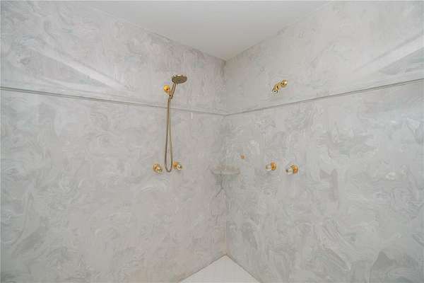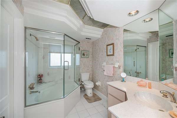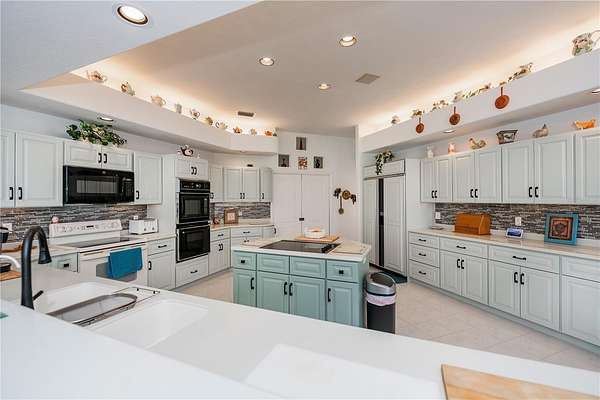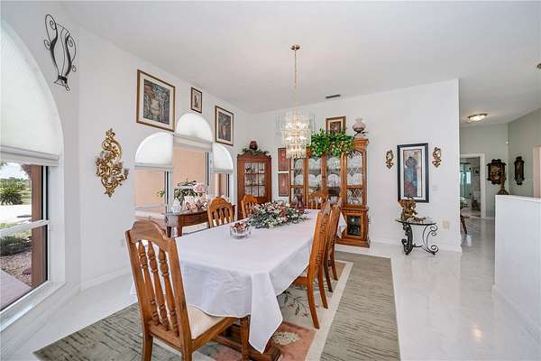 An exquisite dining area beckons you into the heart of the home: a well-appointed kitchen that embodies luxury with top-of-the-line appliances, a Sub-Zero refrigerator, double oven, and vented cooktop in the kitchen island, the modern, seagrass-hued Corian countertops and two-tone cabinetry exude sophistication. There is also a breakfast bar, full-sized dining area, and generous walk-in pantry.