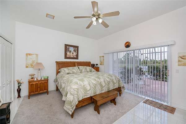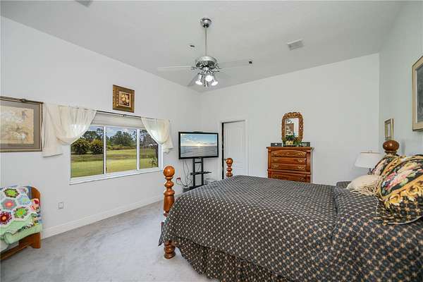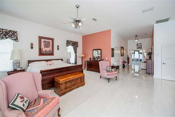 A genuine in-law suite complete with a connected bath and private screened-in patio offers lovely pond views. Additionally, a large laundry room, with substantial storage, a wash sink, and built-in ironing board, provides easy access to the expansive 3-car garage large enough for large SUVs and includes automated screen doors to keep insects at bay.