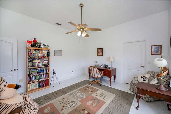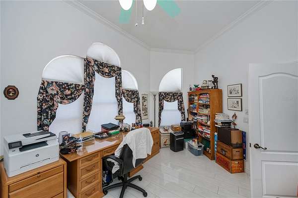 Off the entry, a private office space perfect for remote work or an additional bedroom, is next to the luxurious Owners' Suite. This personal sanctuary boasts private pool access, a coffered ceiling, dual spacious California closets, and an opulent en-suite bathroom featuring a jetted jacuzzi tub, dual sinks, large linen closet, and a huge Roman shower. Enjoy the tranquility of your surroundings in your personal retreat.