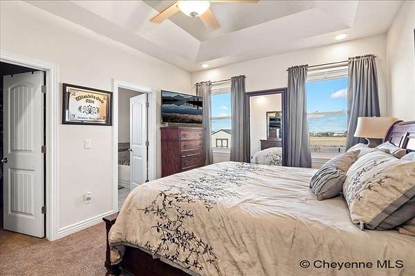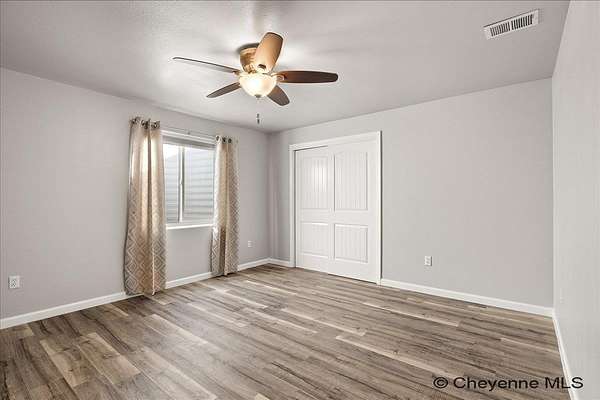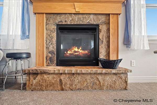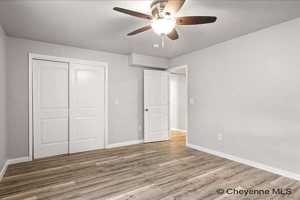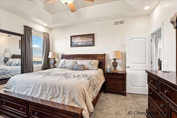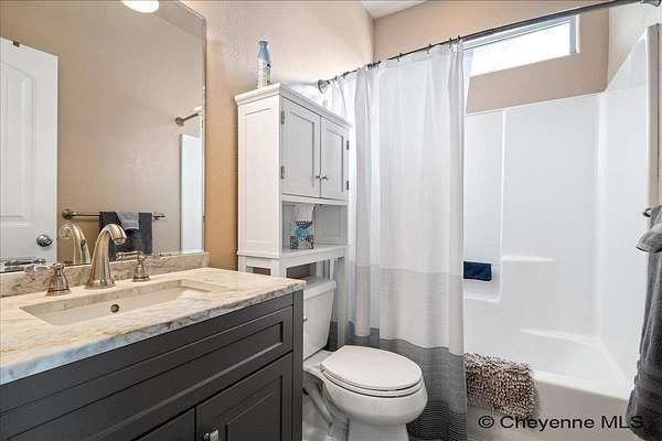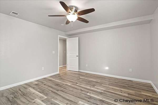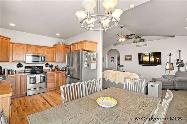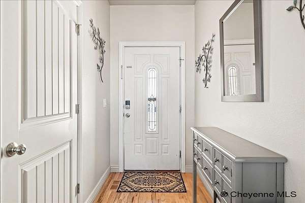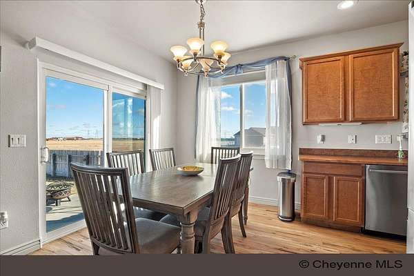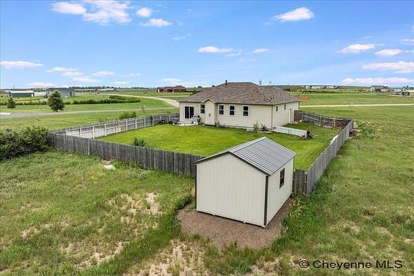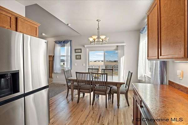 Impeccable Rural Home in Cardinal Estates! Nestled in a rural subdivision just east of town, this Wyoming haven blends serene country vibes with everyday ease. Stunning refinished hardwood flows through entry, hall, kitchen, and dining. Expansive living room boasts vaulted ceilings, a cozy gas fireplace, and abundant natural light from oversized windows. Lavish primary suite features a walk-in closet, tray ceiling, and luxe 5-piece bath. Finished basement shines with a massive rec- room and three generous bedrooms. Ample oversized closets handle all your storage. Stay cozy year-round via forced-air heat and central AC. Fenced backyard includes a 12x16 shed; front and back yards flaunt sod and sprinklers. Brick-and-vinyl exterior promises low-maintenance appeal. Pride of ownership radiates throughout this pristine retreat!