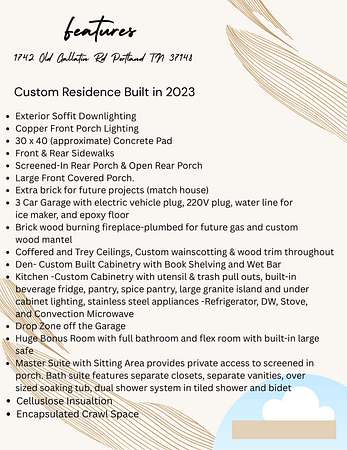 Welcome to this Exceptional 2023 Custom Built Home offering the perfect location to all things! Only 45 minutes to Nashville or Bowling Green,KY and minutes to all things local in Hendersonville & Gallatin... Boat Ramps, Golf Courses, Restaurants, Shopping & Entertainment! Situated on 1.89 Acres this meticulously designed property features high level craftsmanship, custom cabinetry and exquisite trim work throughout. Step inside to discover soaring ceilings and an elegant coffered ceiling that add character to the open-concept living spaces. The gourmet kitchen is complete with custom cabinetry, a dedicated pantry, spice pantry, custom pull-outs, beverage refrigerator and expansive granite island for your prepping needs. Enjoy seamless indoor-outdoor living with a screened-in porch, accessible directly from the living space and master suite. The luxurious primary suite includes a sitting area, separate closets and vanities, oversized soaking tub, a spa-like tiled shower and private access to the screened porch. Entertain with ease in one of the three living spaces this home offers. The living room boasts an abundance of natural light, soaring ceilings and a wood burning fireplace which is also plumbed for future gas. The cozy den provides built-in cabinetry/open shelving and a wet bar. The expansive recreational room over the garage features a full bathroom and a flex room (perfect office) with endless potential. Outside, the home impresses with copper light fixtures, impressive downlighting, front and rear sidewalks, 900sf 3 car garage, electric car plug, 30x40 concrete pad ideal for adding a large workshop/garage. This one of a kind property blends upscale finishes with functionality, making it the perfect place to call home. No HOA. So many more property details -view the Feature Sheet provided with the photos.