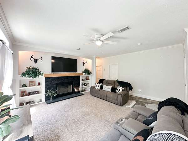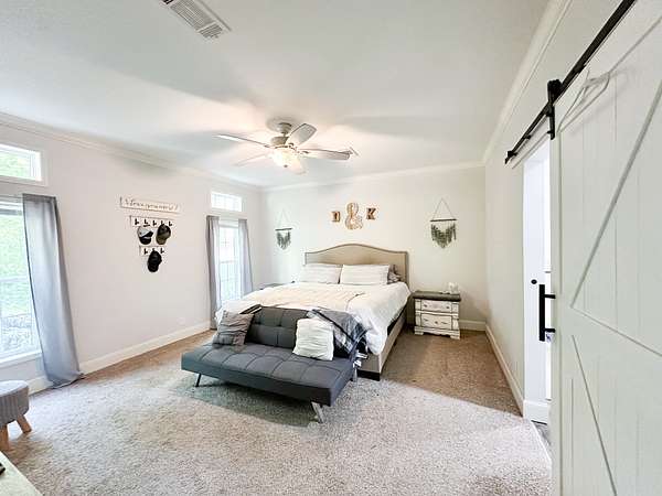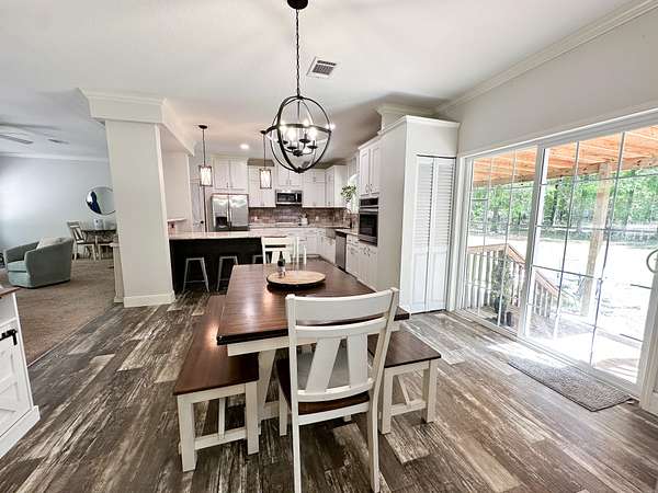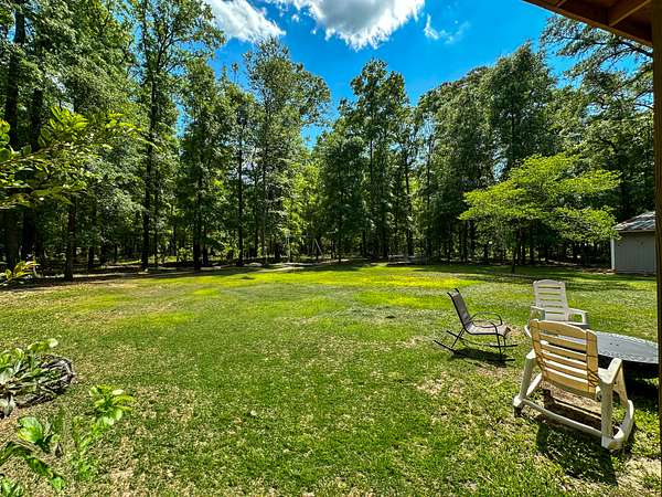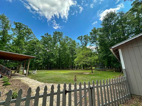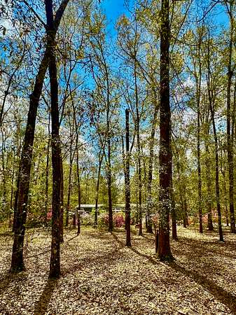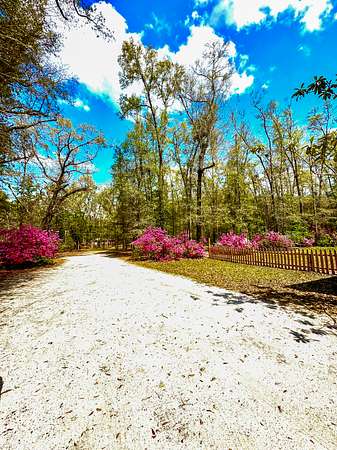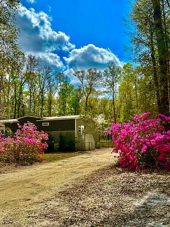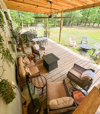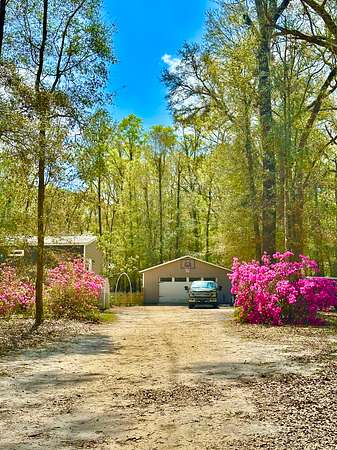 Situated on 6.5 mostly wooded acres, the property is surrounded by majestic oak trees and vibrant azaleas, creating a stunning natural setting. A custom-built covered back deck with a giant fan provides the perfect space for outdoor entertaining or relaxing in the peaceful surroundings.