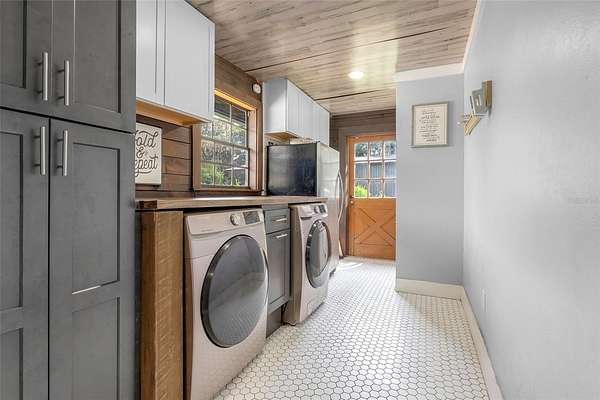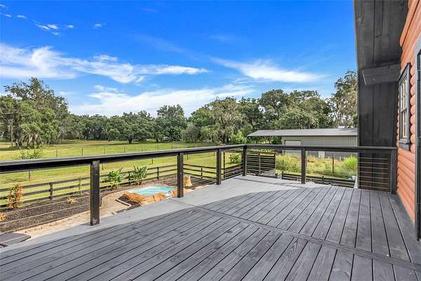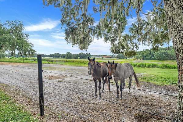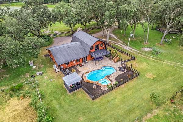 The 5 acres includes 4 well-maintained pastures, each equipped with electric fencing and water access, offering endless possibilities for livestock or crops. In addition, a spacious metal building/shop, equipped with electricity and pre-plumbing, offers ample space for farming equipment, workshops, or storage. The outdoor oasis is perfect for relaxation and entertainment, featuring an in-ground salt water pool and heated spa with paver decking, as well as an outdoor fireplace for cozy evenings. Recent upgrades include a new roof (2019), generator prewire, a fully insulated spray foamed attic, and freshly painted exterior. With no HOA, this property offers ultimate freedom and flexibility. Conveniently located just minutes from The Villages, Lady Lake, Highway 441, and Ocala, this stunning farm estate is minutes to shopping, medical services, and entertainment, while offering the peace and privacy of country living. Bring your animals and enjoy the beauty and tranquility of your very own farm retreat!