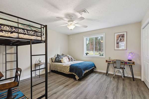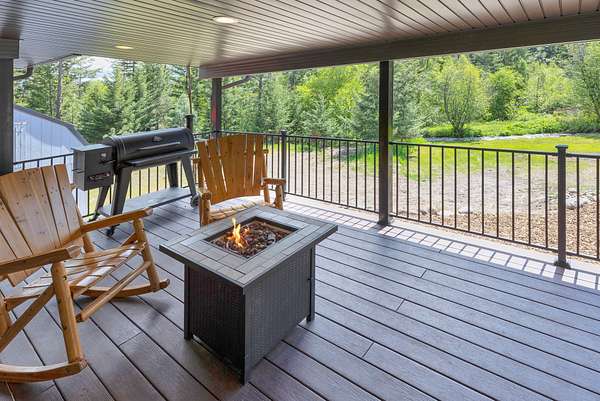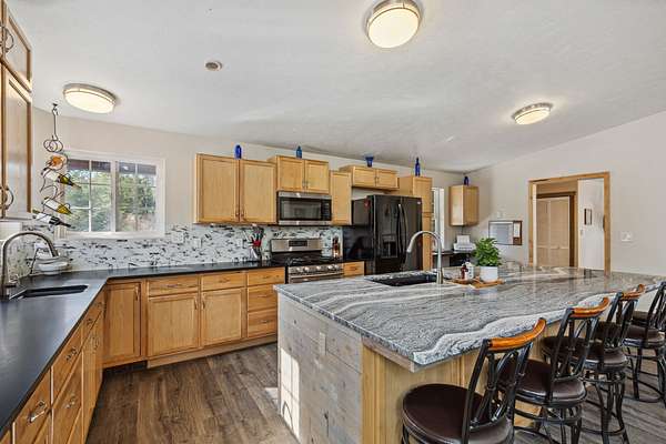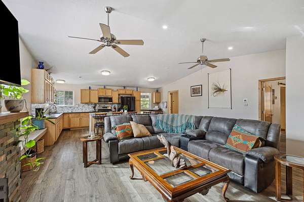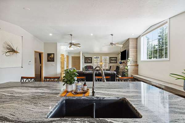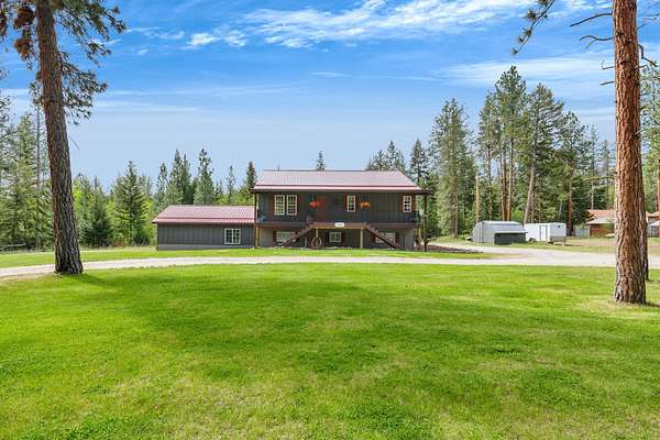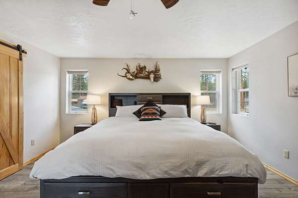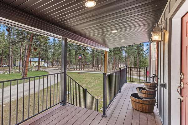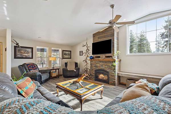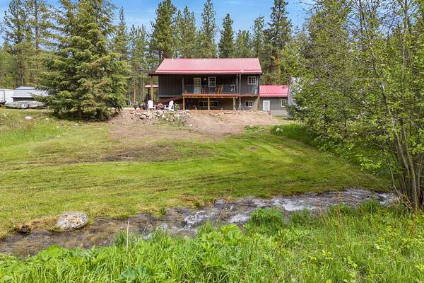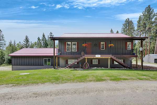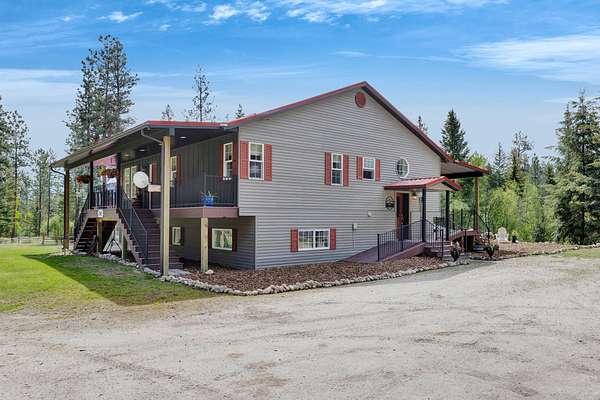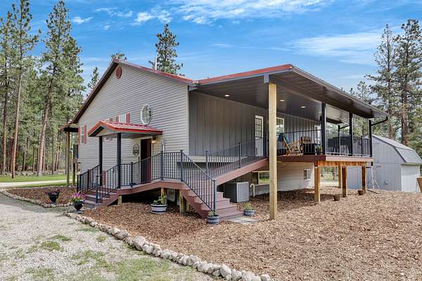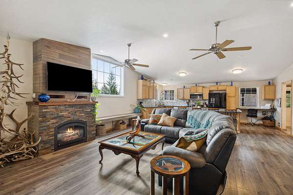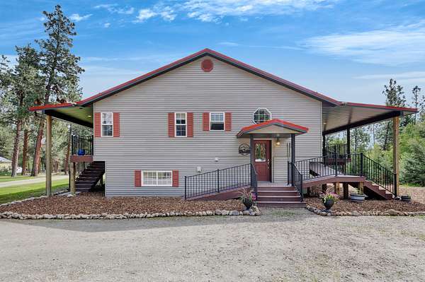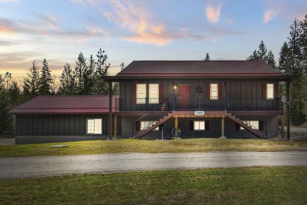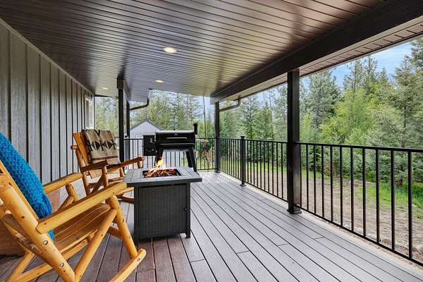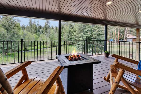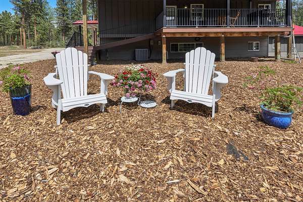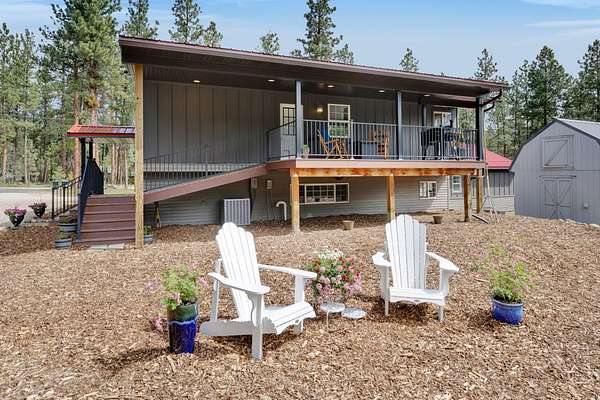 Nestled amongst 2.5 acres of pine trees, 1743 Nighthawk Trail offers secluded serenity with Fred Burr Creek flowing in the distance. This spacious 3,634 square foot home boasts 5 bedrooms and an open-concept layout, featuring a large kitchen island perfect for gatherings. Warm up by the gas fireplace in the cozy living area or retreat to the master bedroom, complete with a walk-in closet and a luxurious custom tile shower with dual heads. Downstairs, discover 4 additional bedrooms, a second laundry room, a convenient wet bar with a refrigerator, and a full bathroom featuring a tile shower and a separate stand-alone soaker tub. Outside, relish in nature's beauty from the covered deck as you watch wildlife and immerse yourself in the tranquil sounds of flowing water. Additionally, the property includes a fenced area, perfect for your horses!