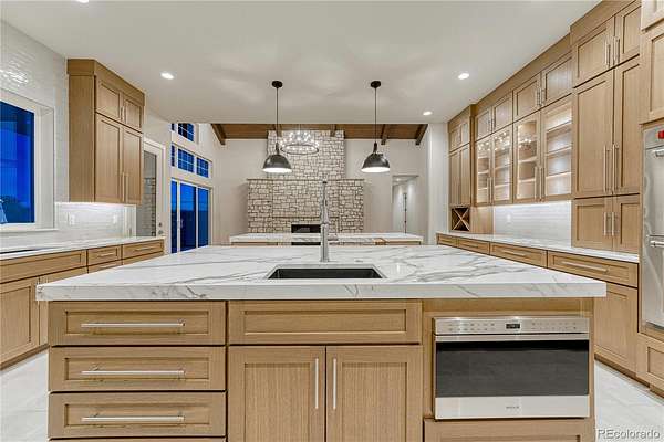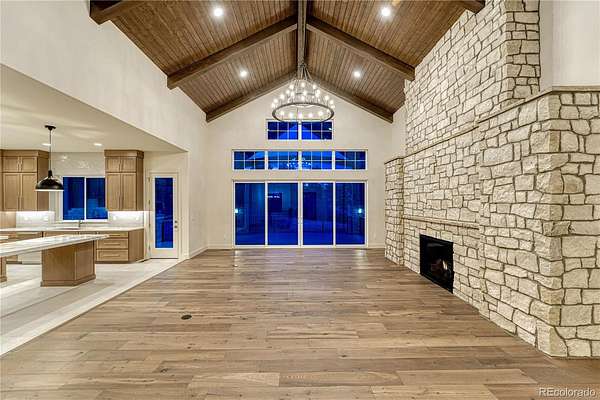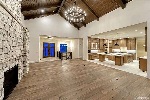 Inside, the vaulted great room showcases stunning wood-clad ceilings and dramatic floor-to-ceiling fireplace, creating a warm and sophisticated gathering space. The chef’s kitchen is a true centerpiece, featuring premium Wolf professional appliances, custom finishes, and seamless flow to the formal dining room—ideal for both entertaining and everyday living. The main floor also features an inviting den with its own fireplace, perfect for cozy evenings or quiet relaxation, along with a private study for work focus. A built-in mudroom adds convenience and organization.