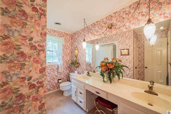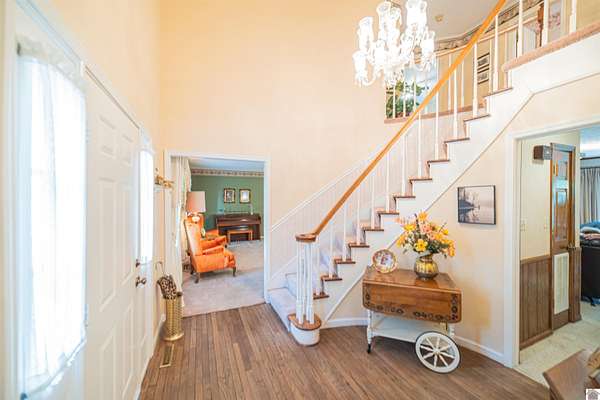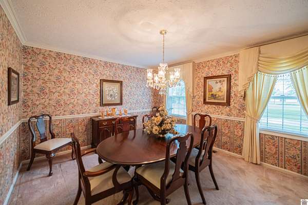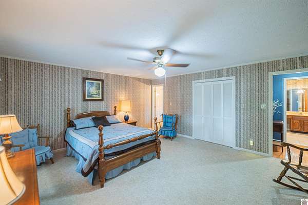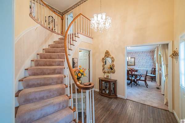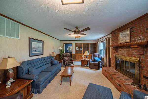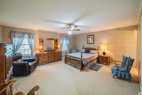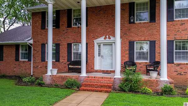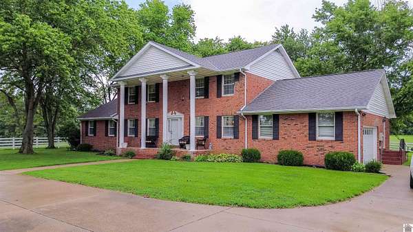 Classic Colonial brick home on pastoral 20 acre farm in Sharpe. Beyond the circle drive & sweeping porch enter the grand 2-story foyer & take in the formal living and dining rooms. An inviting family room features custom wood trim, built-ins, fireplace, & large picture windows offer views of rolling farmland. The den flows seamlessly into the kitchen w/ oak cabinets & breakfast nook. The 1st level primary suite boasts large closets & his & hers bathrooms. Upstairs, you'll find a 2nd primary w/ en suite bath, 3 additional bedrooms & full bathroom. A finished basement awaits, perfect for game room or shelter from storms. In addition to attached garage, the property includes a barn, a versatile building-perfectly suited for conversion into guest quarters or a future pool house, pond & fencing. Don't miss the rare opportunity to acquire an estate within one of Marshall County's most sought-after areas, conveniently located between Kentucky Lake & Paducah & 2 hours away from Nashville, TN.