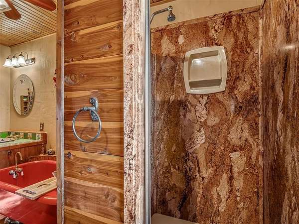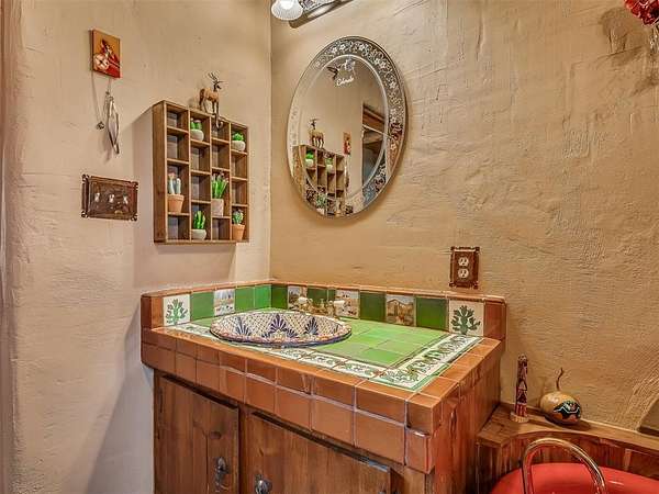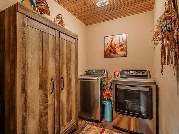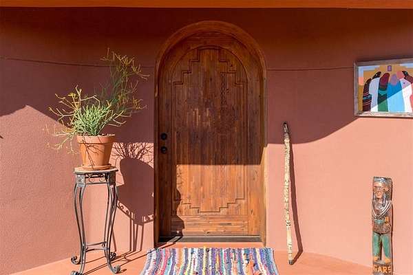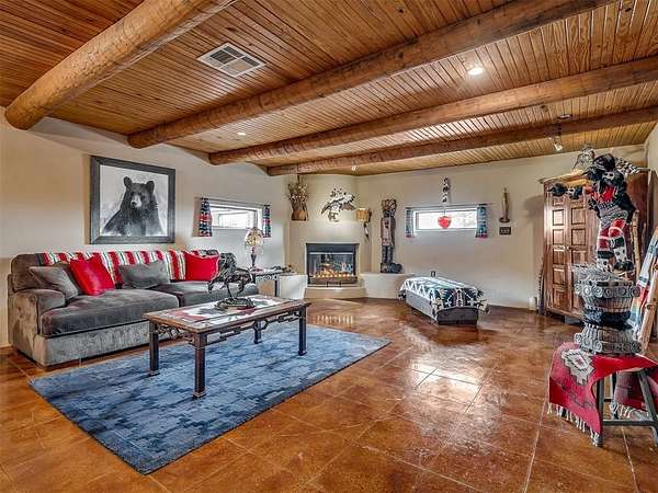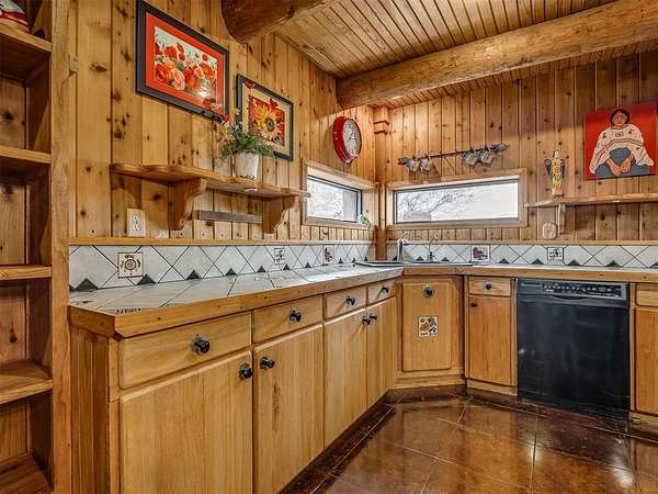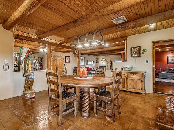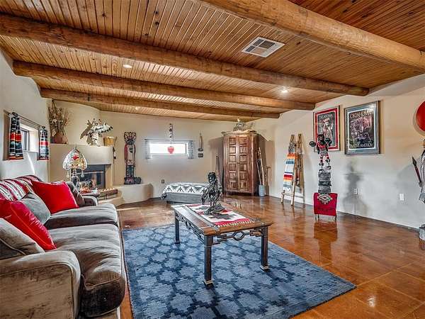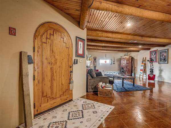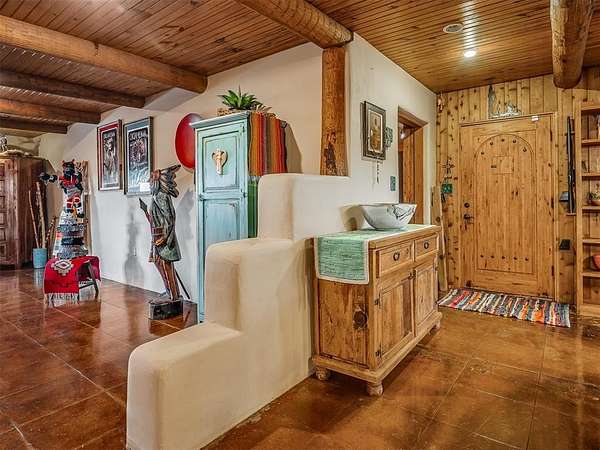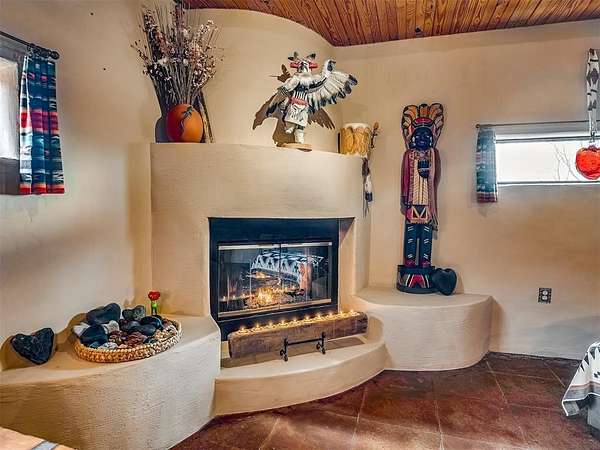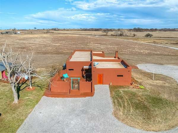 The Ultimate Adobe Sanctuary: A Fortress with Native American Roots This adobe home, on 20 acres of stunning landscape, is a fortress and a sanctuary. Constructed with 12-inch-thick concrete and stucco walls boasting an R50 insulation rating, and a six-inch sloped concrete roof designed to channel rainwater, it's as energy-efficient as it is durable. Reinforced windows with steel plates, two-inch-thick alder wood doors with oak cross-timbers, and a steel-doored basement shelter make it a true stronghold. Inside, the home radiates warmth and craftsmanship. Hand-stained concrete floors, grooved to resemble rustic tile, pair beautifully with 12-inch log beams that frame the ceilings. A corner fireplace adds an impressive focal point, while custom red oak cabinets and tile inlays enrich the kitchen's charm. Thoughtful details like a cherry-red clawfoot tub and mission-style alder wood doors reflect timeless elegance. The layout ensures stunning views of the courtyards and surrounding property, creating a seamless blend of comfort and functionality. This home is deeply rooted in Native American heritage, evident in its design, materials, and orientation. Stucco walls, handcrafted finishes, and a thoughtful connection to the land honor traditional principles. More than just a home, this adobe sanctuary offers security, serenity, and a profound sense of history-an extraordinary place to live and thrive. The property is equally impressive. A serene pond, a creek lined with pecan and persimmon trees, and open pastures create a natural haven. A fully insulated greenhouse supports year-round gardening, while a 16x30-foot workshop with an office provides versatile space for projects or quiet retreats. A cozy bunkhouse with heat and air conditioning offers additional living space, making the property perfect for self-sufficiency and relaxation. Buyer to verify all information. Square footage does not include bunk house or green house.