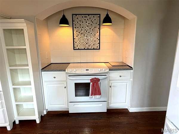 The kitchen retains its original charm while offering ample cabinetry, generous counter space, and a practical connection to the dining area, creating a space that is both efficient and welcoming. Adjacent dining and living areas provide flexibility for everyday living or entertaining.