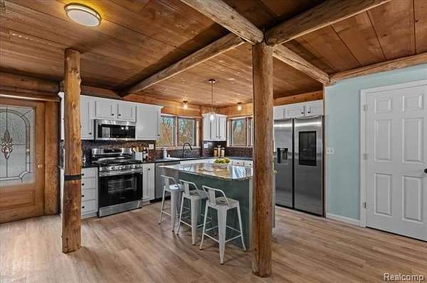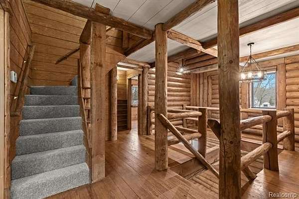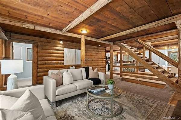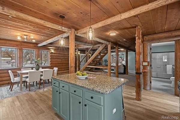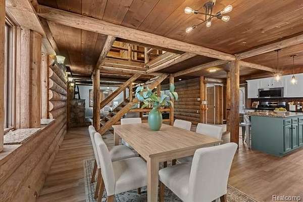 Rare Opportunity Featuring a True Private In-Law Suite on 1.89 Acres. Beautiful log cabin-style home with a modern, refined feel, thoughtfully updated while preserving its natural warmth and character. Natural wood walls and trim are paired with contemporary finishes throughout, creating a unique blend of rustic charm and modern comfort.