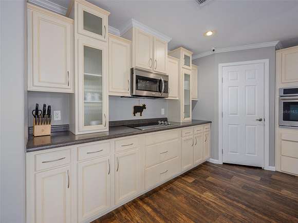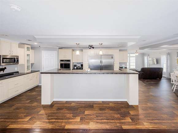 The 3,000 sq. ft. modular home, just 10 years old, features two primary suites for privacy and comfort. The luxury kitchen, equipped with Frigidaire Gallery appliances, is perfect for cooking and entertaining. Step outside to the huge 25x40 covered and screened porch, complete with two flat-screen TVs, providing an incredible space for relaxing or entertaining while enjoying the serene lake views.