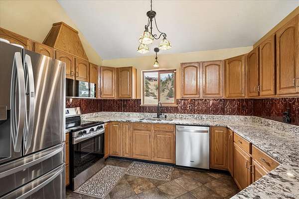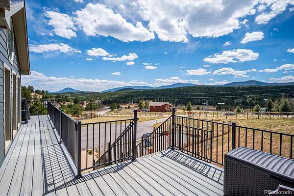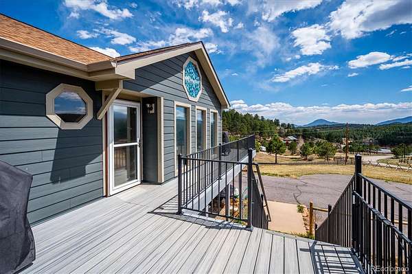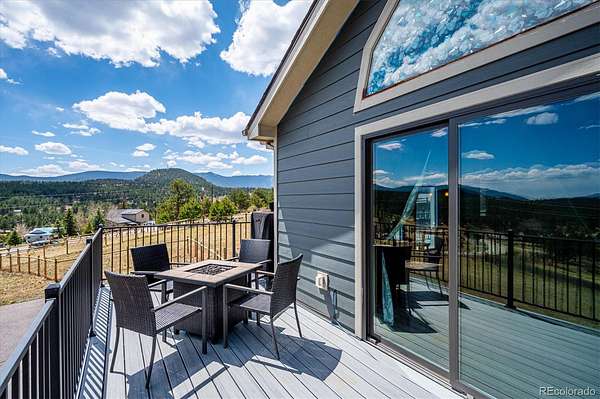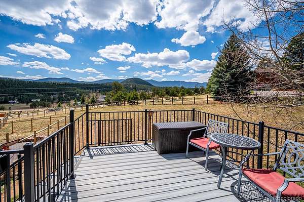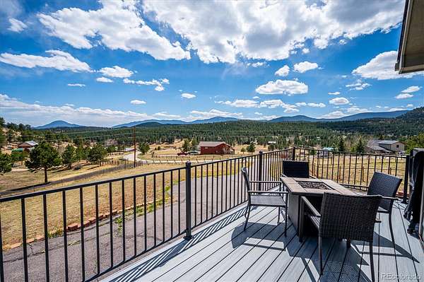 Mountain living meets everyday comfort on 2.5 usable fenced acres with sweeping mountain views in Burland Meadows. This 5-bedroom, 3-bath home offers 2,232 finished square feet, a flexible layout, and an attached 2-car garage with additional off-street parking. Vaulted ceilings, large windows, and an open floor plan create a bright, spacious main living area designed to capture the surrounding scenery. The updated kitchen features granite countertops, solid tin backsplash, stainless steel appliances, ample cabinet storage, and seamless flow to the dining and living spaces. Luxury vinyl plank flooring spans much of the main level, while custom solid oak stairs add warmth and character. The main-level primary suite includes a private 3/4 bath, with two additional bedrooms, another 3/4 bath and the laundry closet with washer and dryer included on the main floor. The finished basement expands the living space with two additional bedrooms and a full bath with utility sink. One lower-level room is non-conforming (no closet) but is ideal for an office, flex space or storage. There is also ample storage under the stairs or in the 2 backyard sheds. Outdoor living is a standout feature with a newer wraparound Trex deck, fenced yard area, open meadow space, and panoramic mountain vistas. Private well and septic systems serve the property, with updates including new pressure tank, water softener and whole house filtration system (6yrs), new 300 gallon water storage tank, roof (2019), Pella slider (5yrs), newer exterior paint, updated fixtures. LVP flooring (6yrs). Located on a paved public road with convenient access to Highway 285, this property offers the balance of mountain setting, usable land, and practical access. VA assumable loan opportunity at 4.25% may be available for qualified VA buyers.