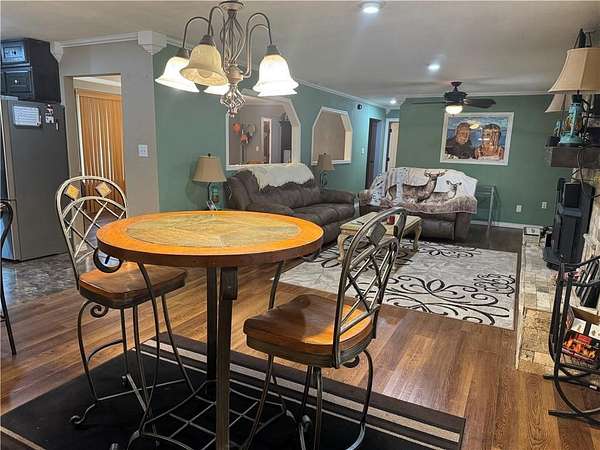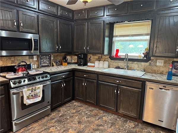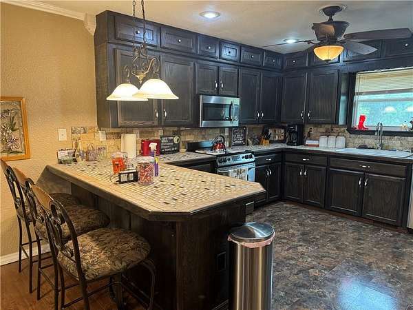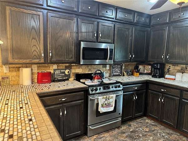 - Blinds, Built-Ins, Ceiling Fans, Ceramic Tile Counters, Drapes, Eat-in-Kitchen, Ice Maker Connection, Pantry, Smoke Detector, Split Floor Plan, Woodstove