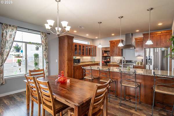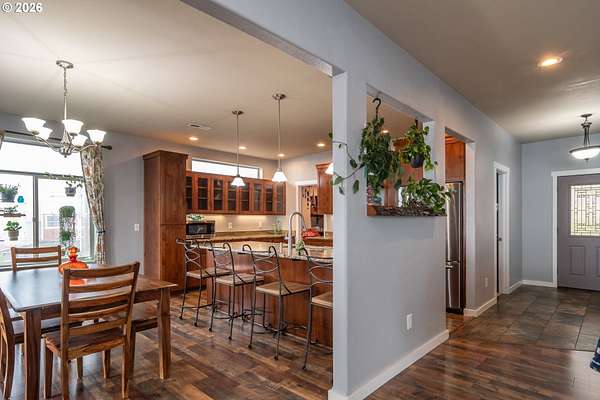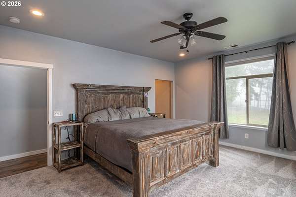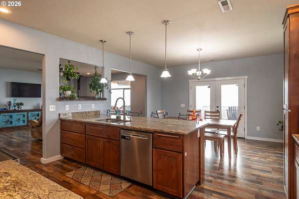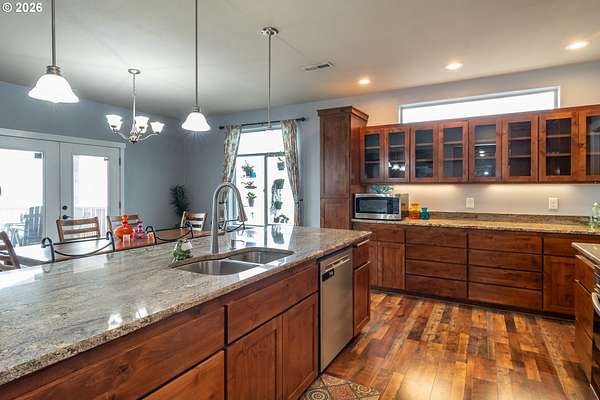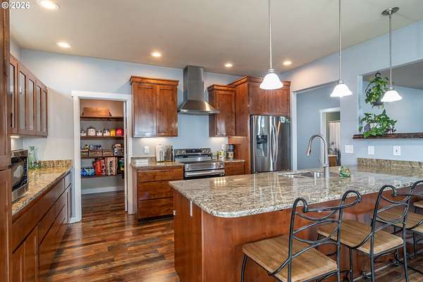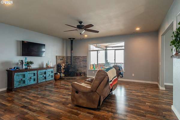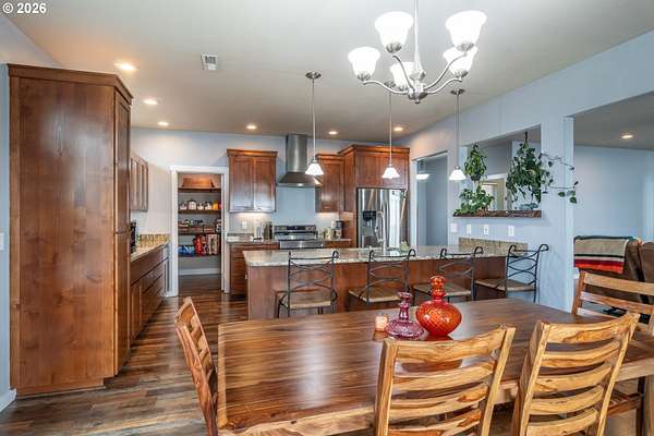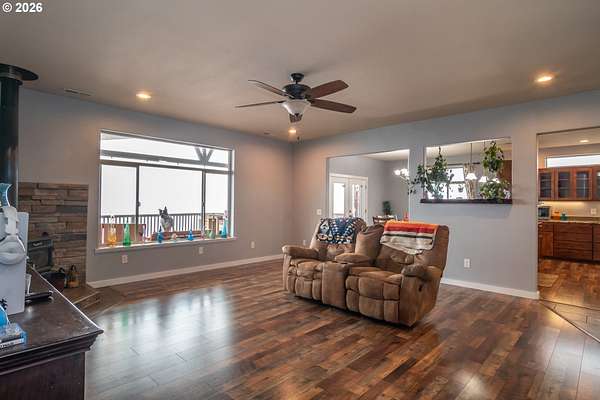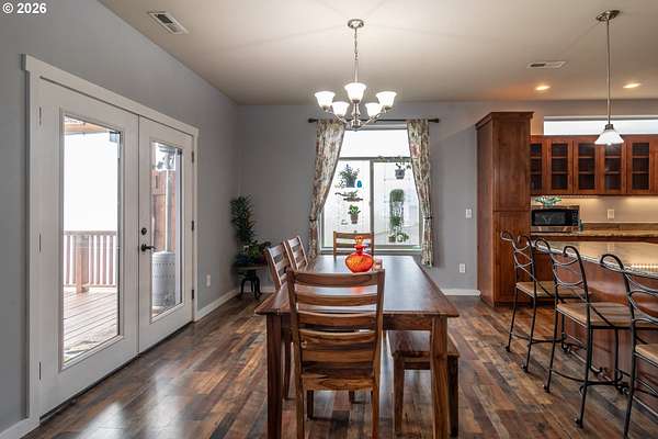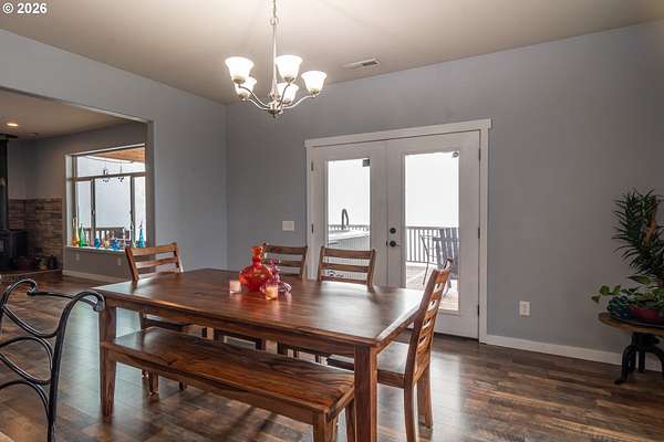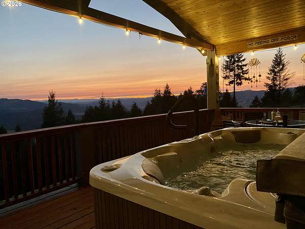 Beautifully updated single-level home with expansive views of the mountains and valley, set on 5+ acres. Enjoy all four seasons from the covered deck overlooking the valley, whether relaxing in the hot tub or taking in the serenity. This 3 bed, 2 bath home offers a spacious, open layout flooded with natural light. The large kitchen features an island with eat bar, ample cabinetry, pantry accented with reclaimed wood from the property, and generous additional counter space. The dining room opens directly to the covered deck through French doors, creating an easy flow for indoor-outdoor living. The living room includes a woodstove and large windows framing mountain views. Bedrooms offer a mix of finishes, including carpet and madrone flooring. The primary suite provides plenty of space, a walk-in closet, and a large walk-in tile shower. All appliances and hot tub included. A peaceful setting with room to breathe. Schedule your showing today.