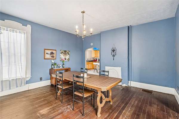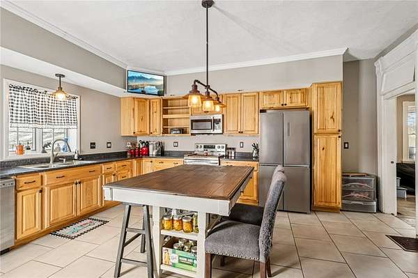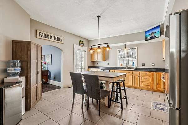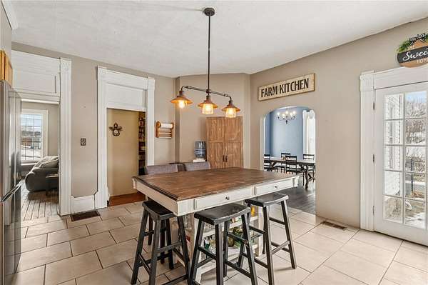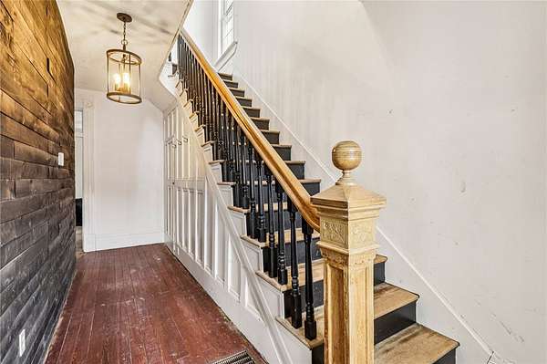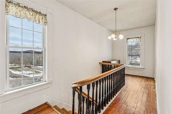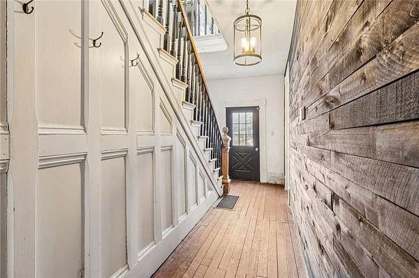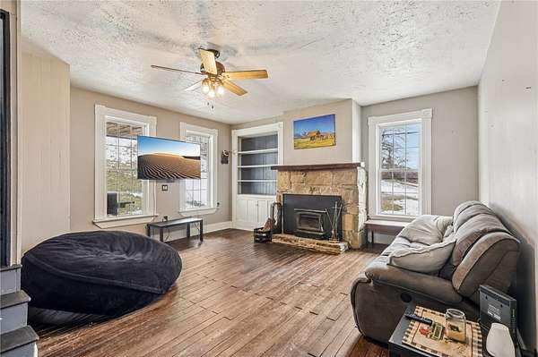 Enjoy peaceful country living in this beautifully updated farmhouse full of charm, set on 5 serene acres. The renovated kitchen features solid hickory wood cabinets, generous counter space, and a spacious pantry--perfect for storage and entertaining. The inviting living room showcases hardwood floors, a stunning wood-burning stone fireplace, and a built-in cabinet that adds warmth and character. A convenient first-floor laundry room with a full bathroom is located just off the rear entrance, ideal for busy households. Upstairs, you'll find three generously sized bedrooms and a beautifully renovated full bathroom. Step outside to relax on the covered rear porch, enjoy the fenced in yard, and take advantage of the detached two-car garage offering plenty of space for vehicles, hobbies, and storage. This property blends modern updates with timeless farmhouse appeal--ready for you to call home.