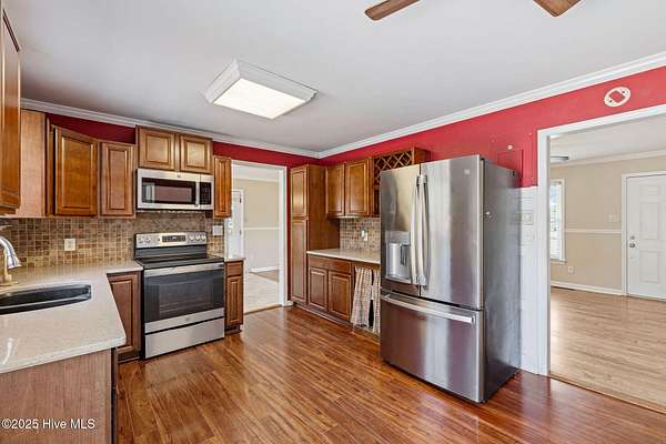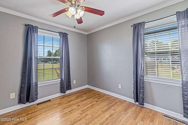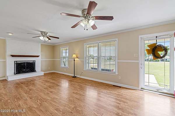 - Blinds/Shades, Ceiling Fan(s), Gas Log, Master Downstairs, Solid Surface