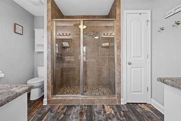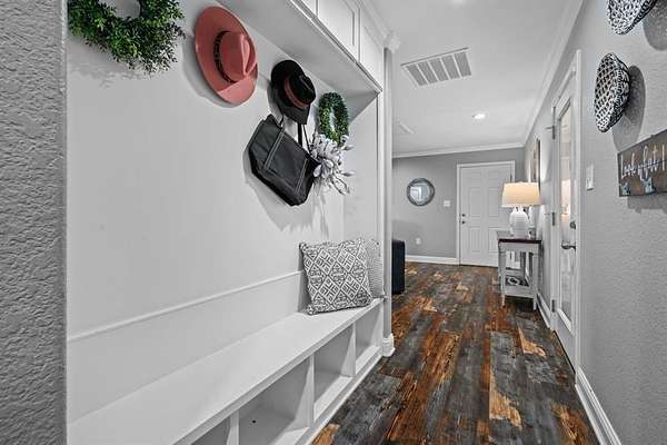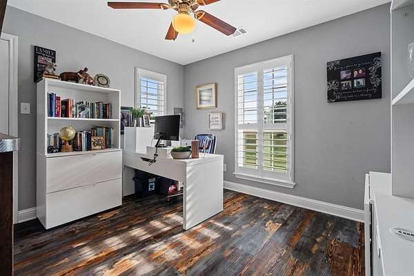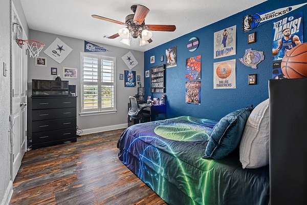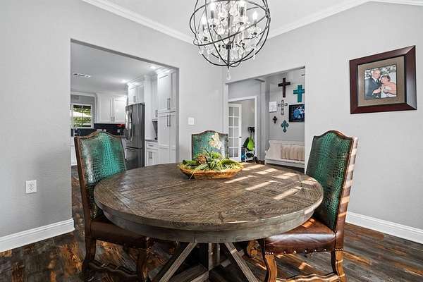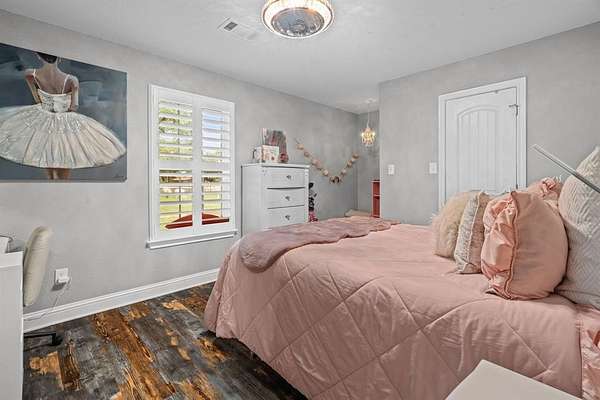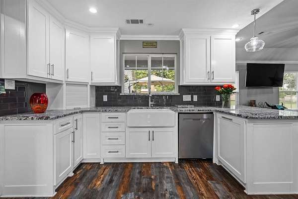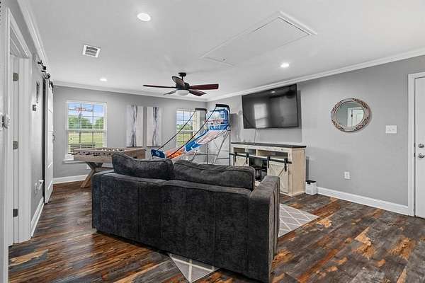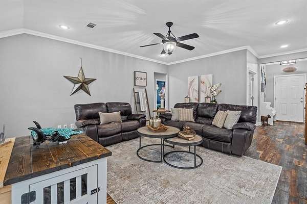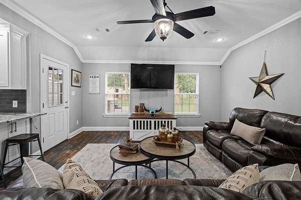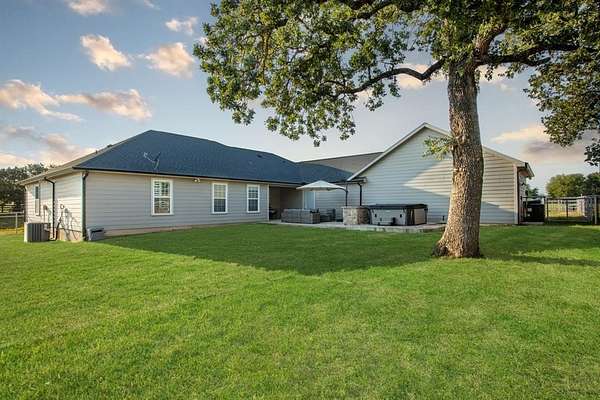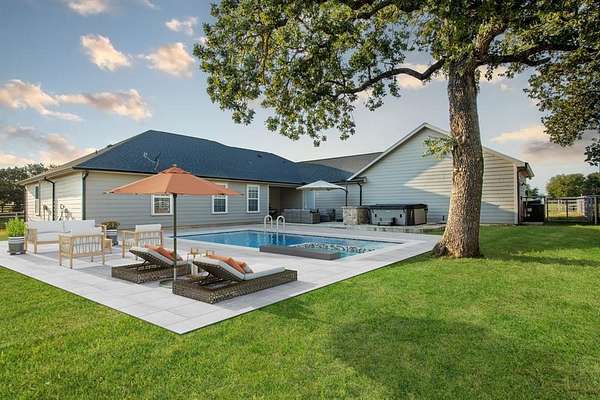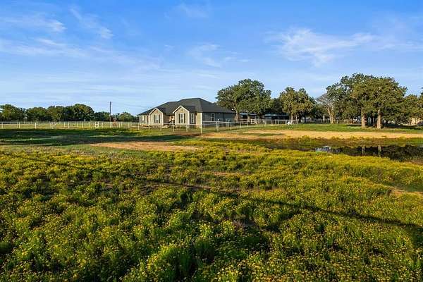 Welcome to your storybook country escape featuring 4 beds plus an office, 3 full baths and 3 living areas (one would make the perfect mother-in-law set up). Where the sky stretches wide, animals roam happily & there is space to breathe. Nestled on 2.152 breathtaking, tree-filled acres in Denton County, with 1.652 acres AG exempt, this enchanting property represents not just living, but belonging. Whether you're a hobby farmer, equestrian, or simply craving peace, this home offers the perfect blend of modern farmhouse living & rural amenities. Be greeted by a covered front porch and pond, made for slow sips, sunsets & stories shared. The entrance is flanked by an office with French doors & spacious dining with built-ins. Plantation shutters & farmhouse-inspired luxury vinyl floors add charm & elegance. Watch animals run free through the farmhouse sink window in the kitchen that boasts granite, stainless appliances, a pot filler, appliance garage, double ovens (conv. microwave), custom pull-out pantry & coffee bar+insta-hot water. Main living frames the unforgettable, panoramic views of the back patio & entertaining space with a built-in prep station for your grill, made for cookouts & star-lit conversations. Primary bed features an oversized tiled shower, 2 granite vanities & a two-compartment walk-in closet, one can double as a storm shelter. Laundry with sink & cabinets tucked behind a barn door. This home has a private wing that includes another living, full bath with walk-in shower, walk-in closet & access to garage, backyard & drop zone area. While currently open, it’s framed for a future privacy wall, should separation be desired which would create the perfect MIL suite. 26x24 epoxy-finished garage has oversized 8 ft. door. Land is fully pipe fenced & features a 31x40 barn with 4 stalls, 1 outfitted for animals. Barn includes full electric, 220 outlet, stained concrete floors, 18 ft. overhead door & drive-through access for vehicles 30ft. long & 18ft. high.