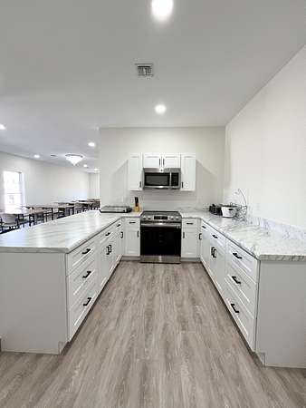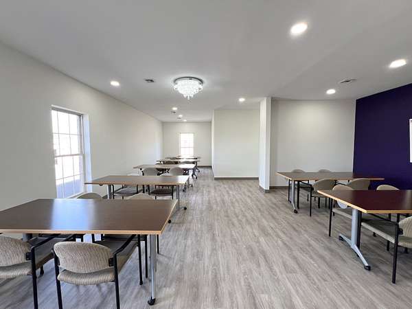 Amenities include: Access to a full kitchen & dining space. Two bathrooms for convenience. Dedicated printer space. Ideal for homeschool groups, counseling sessions, podcasting, and more!